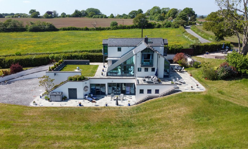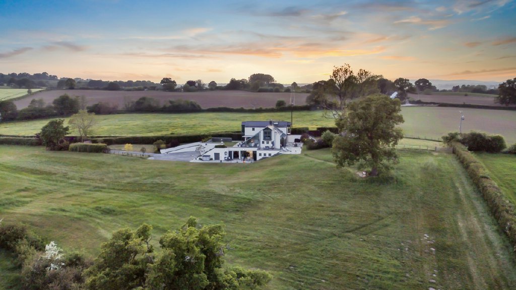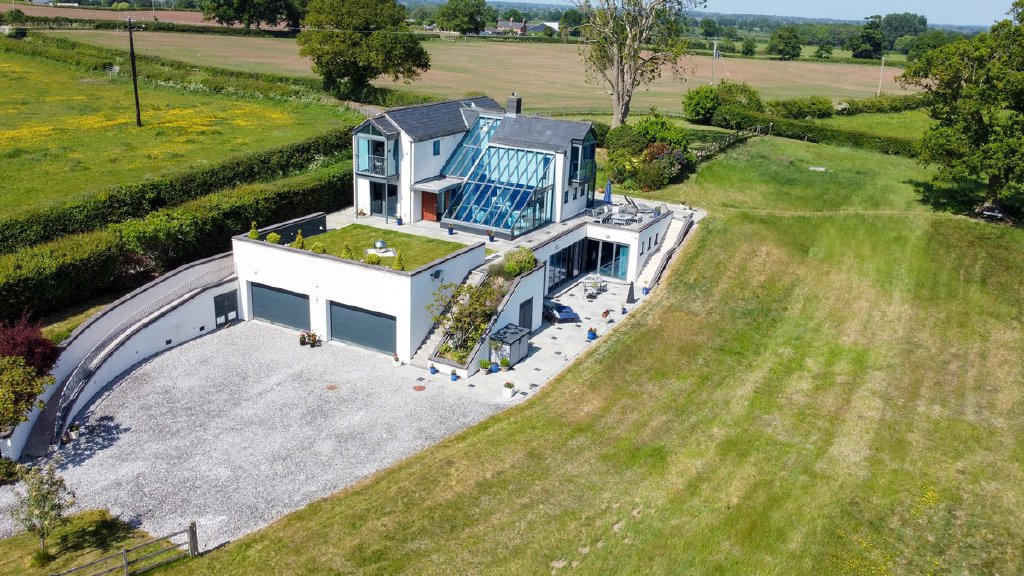 An exceptional modern residence located in 3.5 acres and surrounded by tranquil meres, the rolling hills of North Shropshire, and the Cheshire Plains.