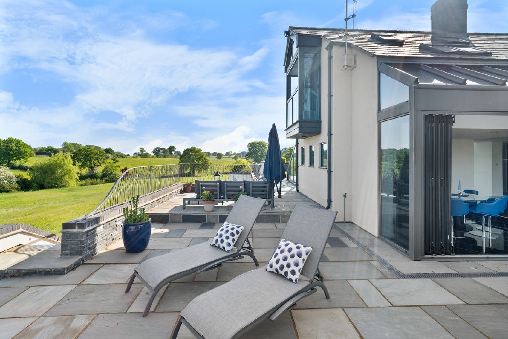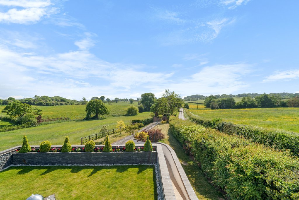 A raised BBQ and entertaining terrace provide elevated views across the Cheshire and Shropshire borders, expansive lawns, and paddocks, all framed by mature planting and the namesake oak trees that punctuate the grounds with timeless beauty. The surrounding vistas are rich with rural charm, where grazing horses, cattle, and sheep dot the gently undulating Cheshire landscape.