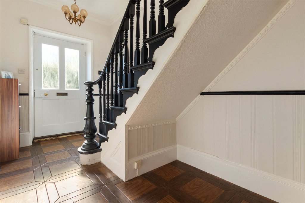A traditional painted solid wood front door opens into the heart of the home, where original features and period detailing create an immediate sense of history and warmth. The generous hallway leads to a series of versatile reception rooms, each with its own character and purpose.