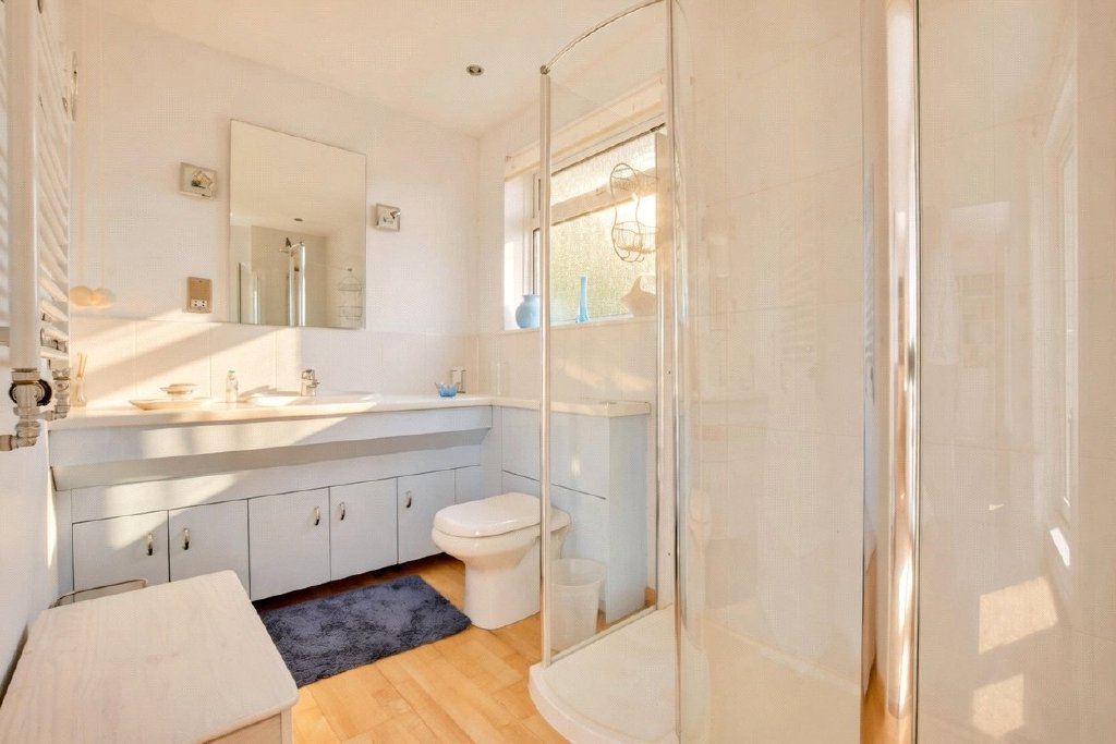A modern three-piece family shower room serves the upstairs bedrooms, while the landing also provides access to one of the property’s most unique and appealing features – a delightful roof terrace. With a contemporary glass balustrade and space for a table and chairs, this elevated area offers an idyllic spot to enjoy morning coffee or evening drinks while taking in the panoramic countryside and estuary views.