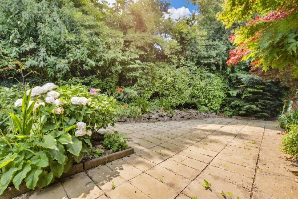 The property is approached via a brick-paved driveway with pillared entrance, leading to a detached garage with power, light, and a workbench. The front and side gardens are exquisitely planted with specimen trees, flowering shrubs, and perennials—designed to provide year-round interest.
