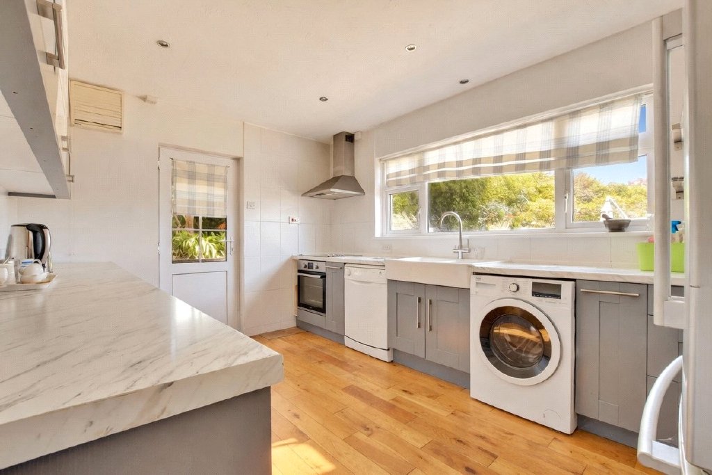 To the right of the hallway is a formal dining room, which could also serve as a second reception room or study, ideal for modern family life or those working from home. A stylish cloakroom and a contemporary, well-fitted kitchen complete the ground floor. The kitchen has been thoughtfully designed, with sleek cabinetry and ample workspace – perfect for both everyday living and entertaining.