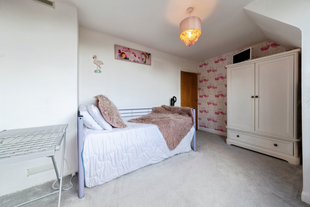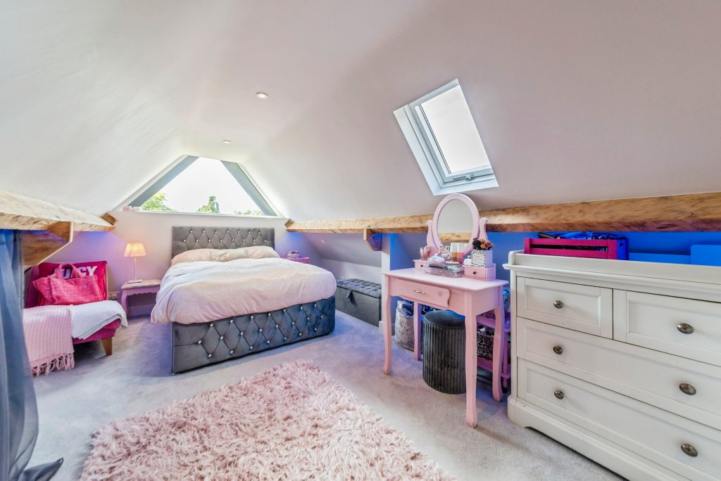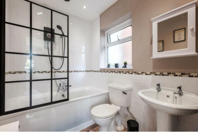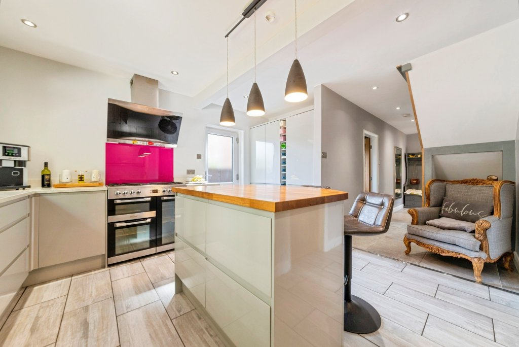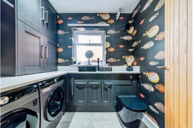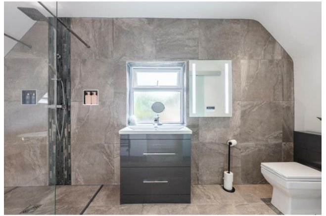 An exceptional detached residence that has been expertly reconfigured and extended to an exacting standard. Now providing a stylish and highly versatile family home, the property extends to approximately 2,456 sq. ft. of internal accommodation, showcasing a ‘wow factor’ at every turn. From the contemporary kitchen to the boutique-inspired bathrooms and feature log-burning stove, every detail has been curated for modern luxury living. GROUND FLOOR A central L-shaped hallway gives a grand sense of arrival, leading to the heart of the home: an expansive dual-aspect Living/Dining room. This vast space is flooded with natural light and features bi-fold doors that create a seamless transition to the gardens. For more intimate evenings, a feature log-burning stove provides a sophisticated focal point. The bespoke Kitchen is perfectly suited to family life, offering views over the landscaped rear grounds and direct access to the side. Adjacent is a second generous Family Room, also enjoying a dual aspect and French doors to the garden. Uniquely, the ground floor also hosts a large double bedroom suite with a private en-suite, offering the ultimate flexibility for guests, teenagers, or those requiring future-proof single-storey living. Completing the ground floor is a beautifully finished utility/cloakroom and a separate guest W.C. FIRST FLOOR To the first floor, a spacious landing leads to four further well-proportioned bedrooms. The Principal Family Bathroom is a masterclass in design, featuring a striking L-shaped layout that incorporates a walk-through wet area and a centerpiece freestanding bath, all finished with high-quality contemporary tiling.