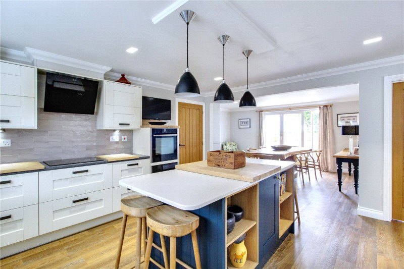 Inside, the tone is immediately contemporary yet welcoming. A spacious reception hall with striking herringbone flooring sets a confident design narrative that continues throughout. At the heart of the house lies an exceptional open-plan kitchen/dining/family room — a space designed around togetherness. Full-width bi-fold doors dissolve the boundary between inside and out, drawing in far-reaching views across open fields to the Blyth Estuary beyond. Whether hosting summer gatherings that spill onto the terrace or enjoying relaxed weekend breakfasts with the doors open to birdsong and breeze, this is a room that adapts effortlessly to the rhythm of family life. The kitchen itself is both elegant and functional, with cream cabinetry, quartz-effect surfaces and a bold navy island anchoring the space — equally suited to informal suppers or celebratory entertaining. A separate sitting room offers a more intimate atmosphere, with dual aspects and French doors opening onto the garden. The log-burning stove provides warmth and focus during the cooler months, creating the perfect setting for cosy evenings after bracing coastal walks. A further snug or home office, with calming field views, ensures flexibility for remote working or quiet retreat.
