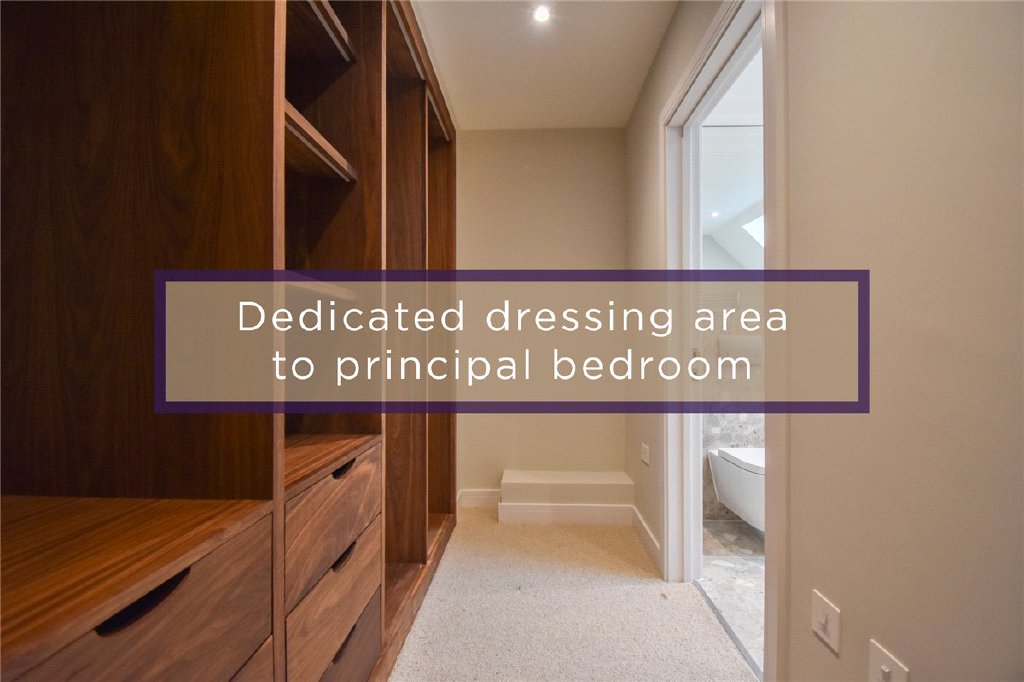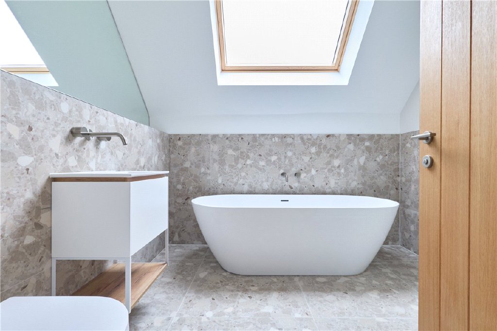 Host to the principle suite with dedicated dressing area, bespoke fitted wardrobes and en-suite with separate shower and free-standing oval bath sitting under the velux window, and a private terrace accessed via velux sliding door benefitting from a southerly aspect - a perfect spot to enjoy warm summer evenings.