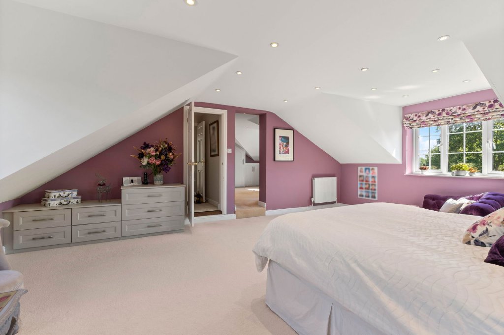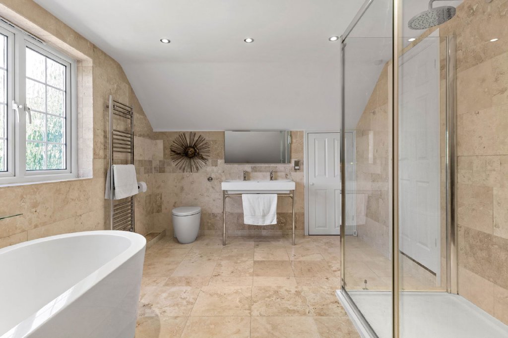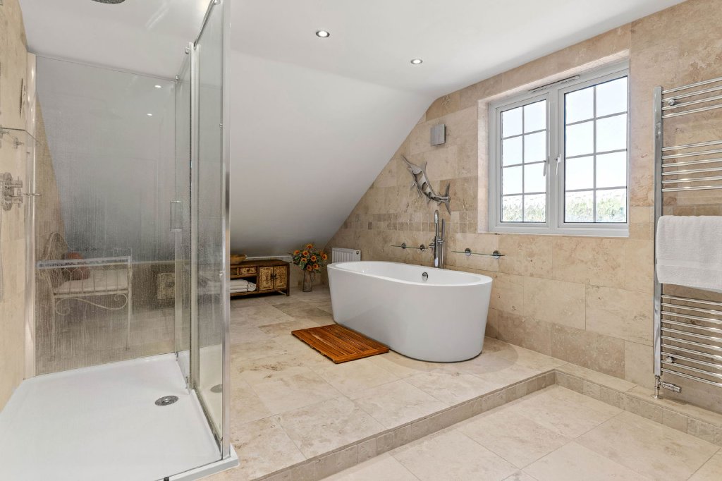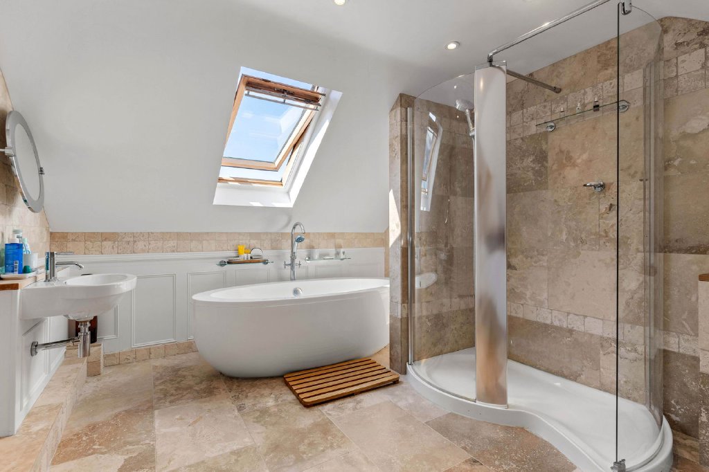 A balustrade staircase leads you up to the first floor where a Velux skylight floods the galleried landing with natural light. The triple-aspect main bedroom features a large walk-in beautifully fitted dressing room and large en-suite bathroom with freestanding bath and separate shower. There is a second triple-aspect bedroom, a further bedroom/guest room and an impressive main bathroom with lots of storage and a separate shower.