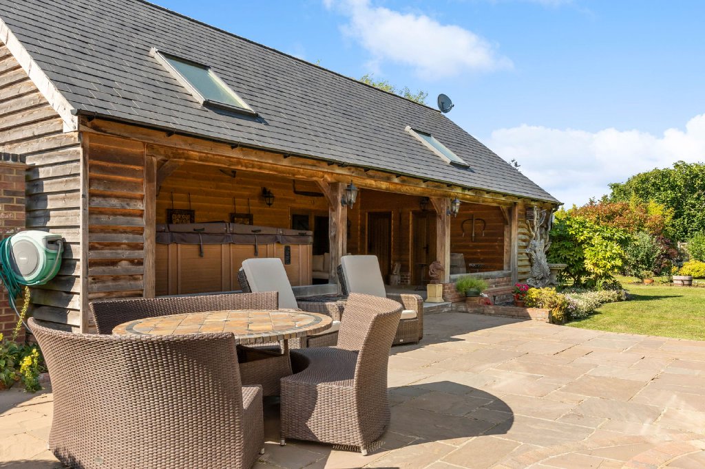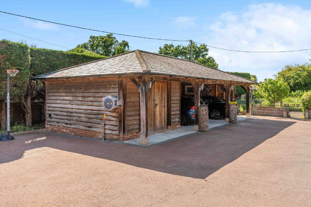 To the front the sweeping driveway leads you to the detached oak framed Cart Lodge with pitched tiled roof and garage/workshop space.