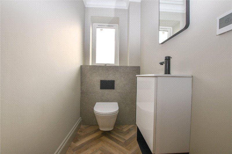 Upstairs, the first floor hosts four double bedrooms. Two benefit from their own en-suites, while a beautifully appointed family bathroom serves the remaining bedrooms. All bathrooms are finished with luxury suites and elegant ceramic tiling to both walls and floors, reflecting the home’s high specification throughout.