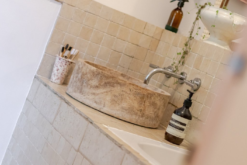 Completing the floor is a beautifully appointed family bathroom, featuring a natural stone hand basin and a bath with an overhead shower, blending style and practicality seamlessly.
