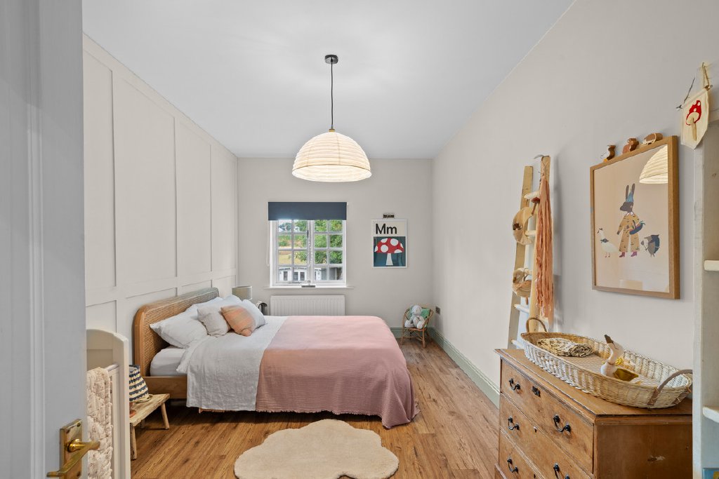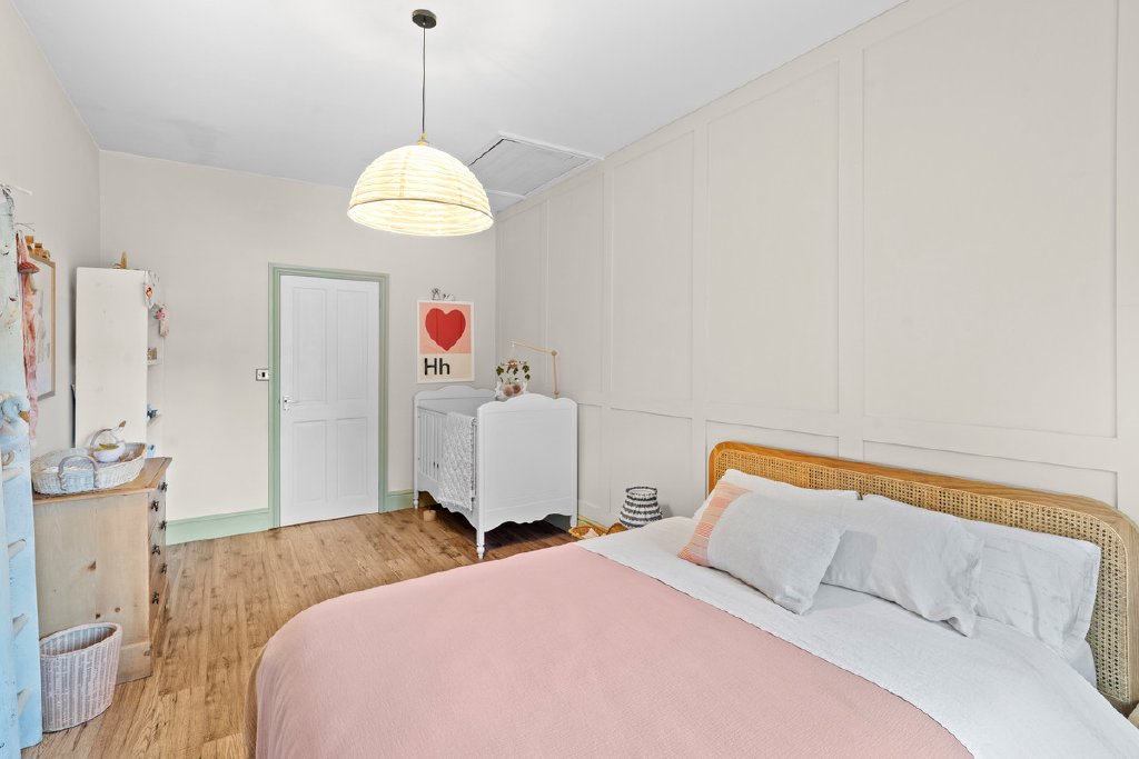The principal suite is particularly spacious, boasting an elegant en-suite bathroom with refined fittings and a tranquil atmosphere. Three further large double bedrooms are filled with natural light and enhanced by charming features such as stained glass windows and painted wood floors, adding character and warmth throughout.