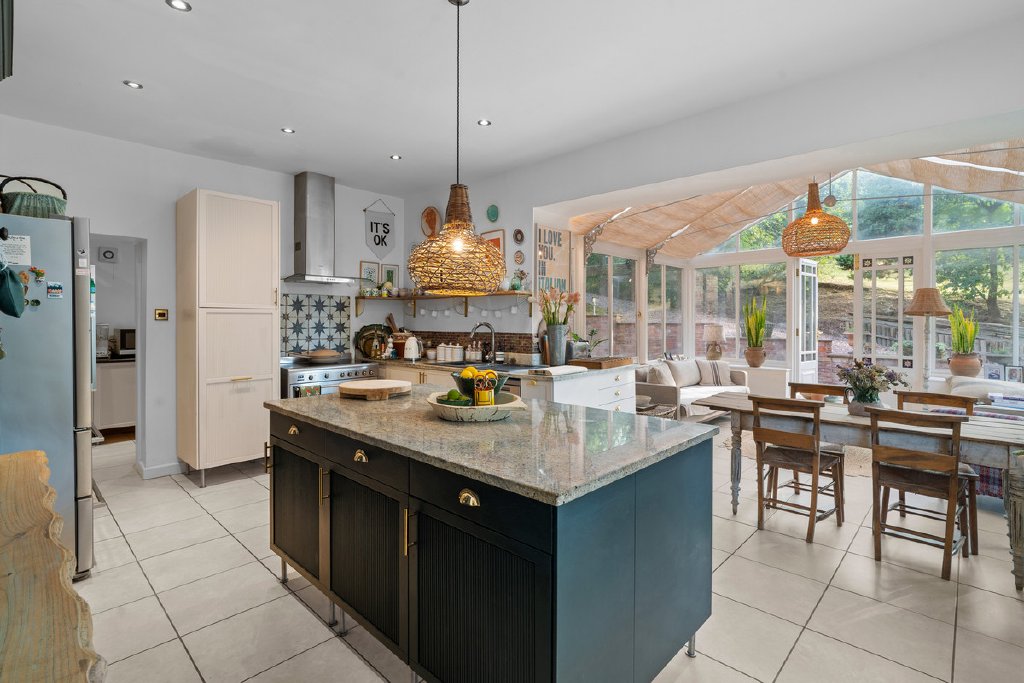Returning to the entrance hallway, you are led to the stunning open-plan bespoke kitchen, expertly crafted with traditional units and a central granite-topped island. This space flows effortlessly into the conservatory family room, where natural light fills every corner, creating a bright and welcoming environment ideal for casual family dining or peaceful mornings with coffee. A separate utility room provides practical convenience with a stable door to the outside, while a newly fitted external boiler is discreetly located just beyond.