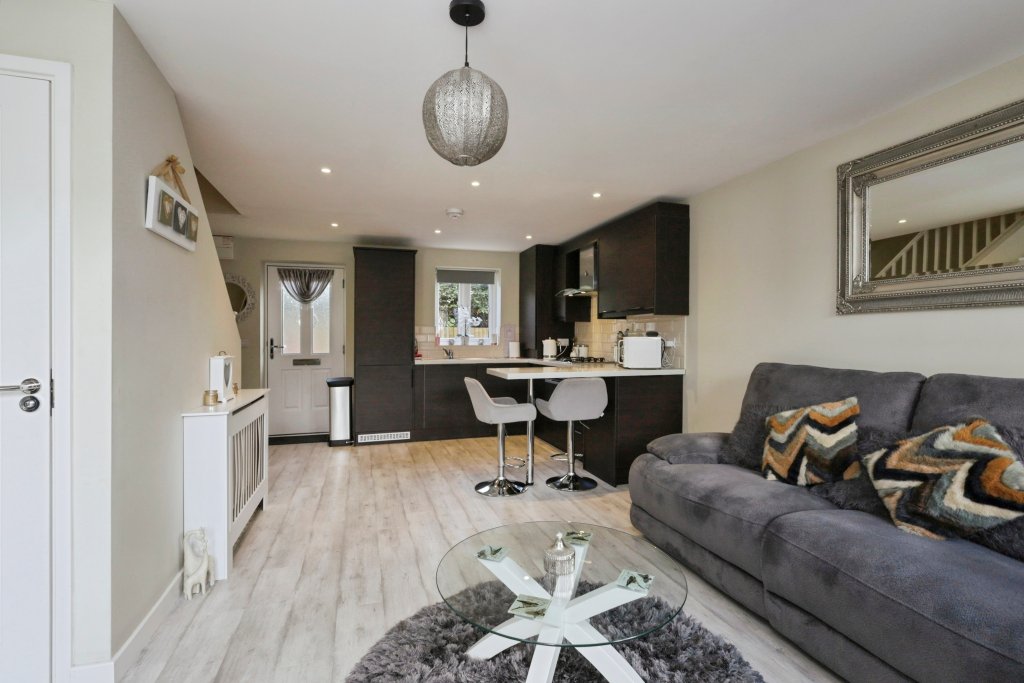 A beautifully presented two bedroom, modern build terraced home with and with TWO BATH/SHOWER ROOMS and DOWN STAIRS WC, situated in a convenient location in Golden Cross. The property is considered to be in excellent modern and well maintained order throughout and offers deceptively spacious accommodation over two storeys. The property opens into the impressive open plan design on the ground floor, measuring approximately 20x14ft and comprising of a high quality fitted kitchen with integrated appliances and living area which enjoys a rear garden outlook and access. The convenient downstairs WC is situated off the living area under the stairs. Stairs rise upto the first floor landing, with loft hatch and access to the two good sized bedrooms. Both bedrooms feature built in wardrobes with mirrored sliding doors, a modern en-suite shower room from the master bedroom and modern fitted bathroom serving bedroom two and guests. Outside, the rear garden has been designed for ease of maintenance, laid with faux lawn with a fenced surround. There are Electric Gates to the communal parking.