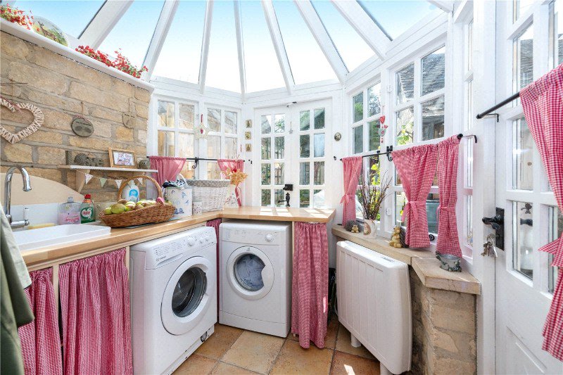 7’6 x 7’5 a cleverly rearranged space, a pleasant garden room is now a functional utility room with glazed roof and part glazed door onto to the westerly facing rear gardens, wood effect roll edge work surface with sink inset and mixer tap over, plumbing and space for washing machine, space for tumble dryer, electric heater, power points and tiled flooring.