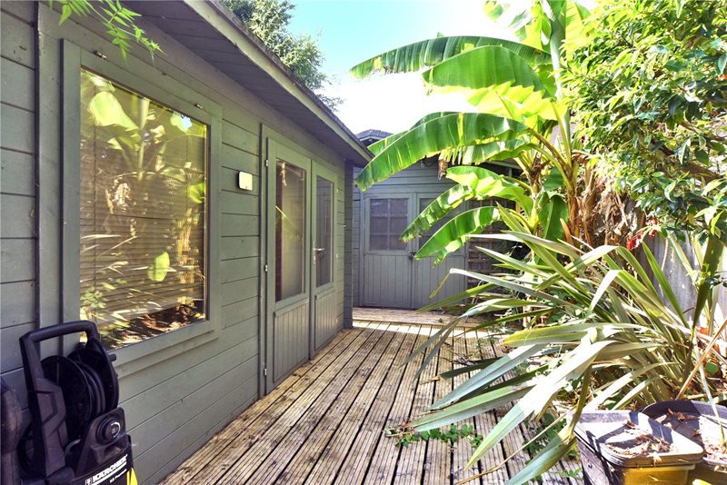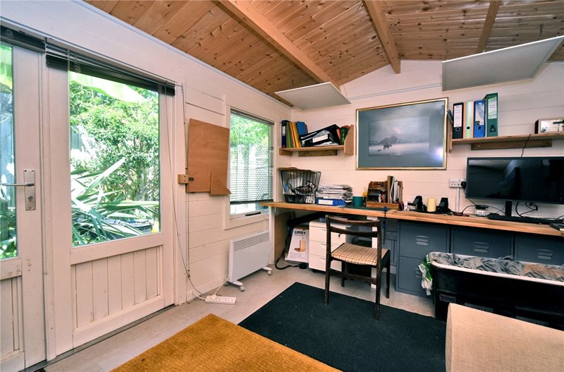 The rear garden extends to approximately 80 feet in length, with a patio adjacent to the house, a lawned area and mature shrub borders. There is also a useful storage shed. At the end of the garden is a purpose built home office with power, lighting, and Wi-Fi.