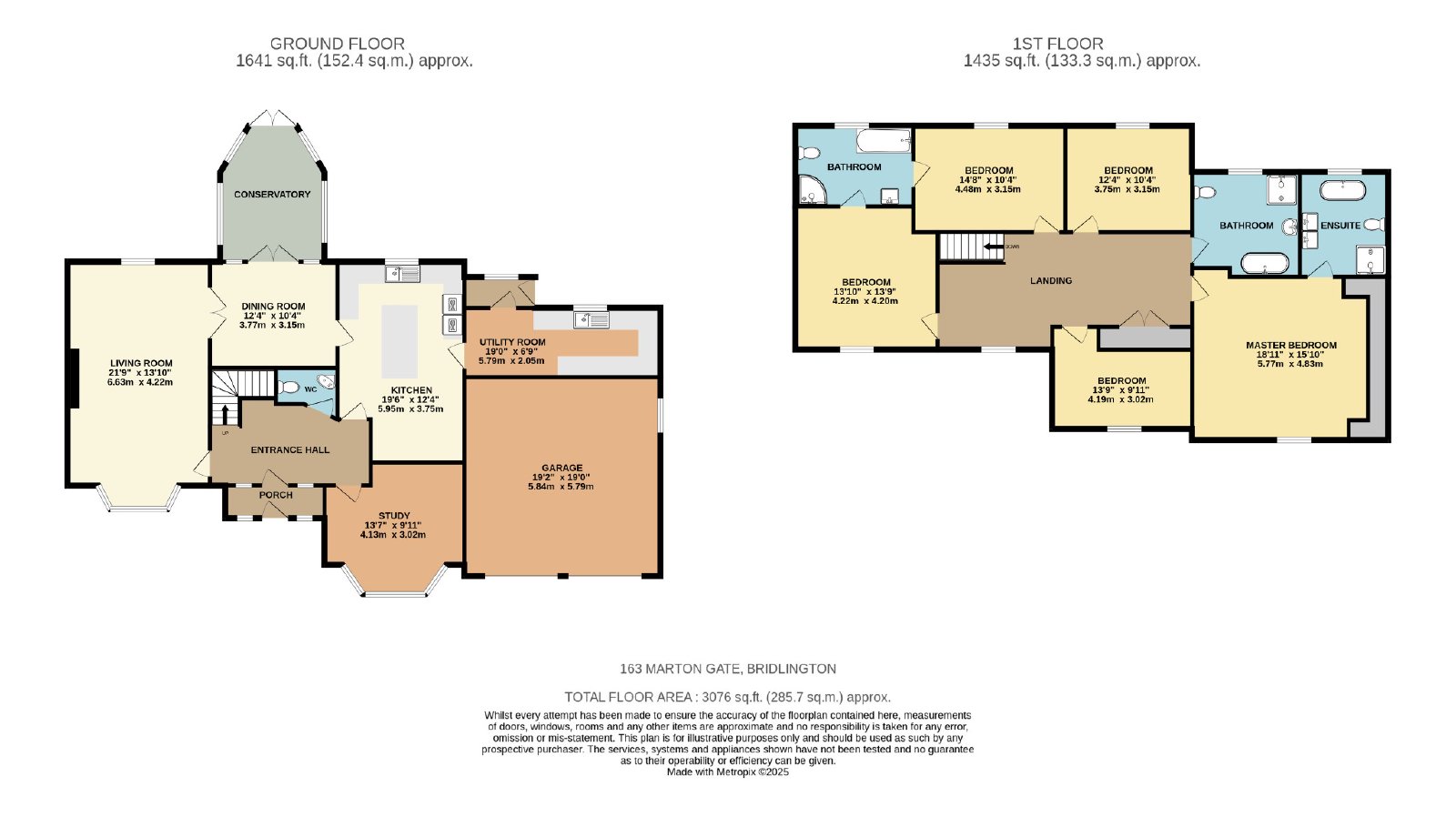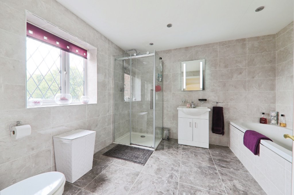 Upstairs, the master suite is spacious and fully fitted, with a luxurious five-piece en-suite. The guest bedroom also has its own en-suite, shared via Jack and Jill access with the third bedroom. Two further doubles and a family bathroom complete the first floor.