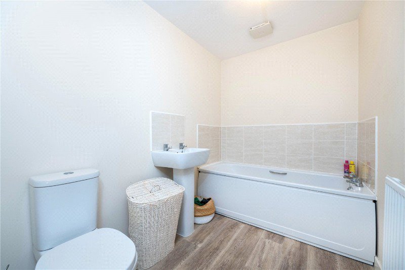 Comprising a modern three-piece suite, low level WC, wash hand basin and panel bath, tiled splashbacks, radiator, extractor fan and finished with wood effect flooring.
