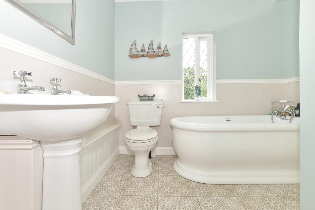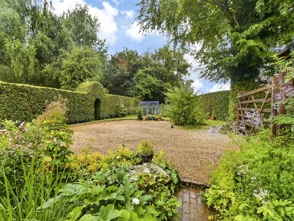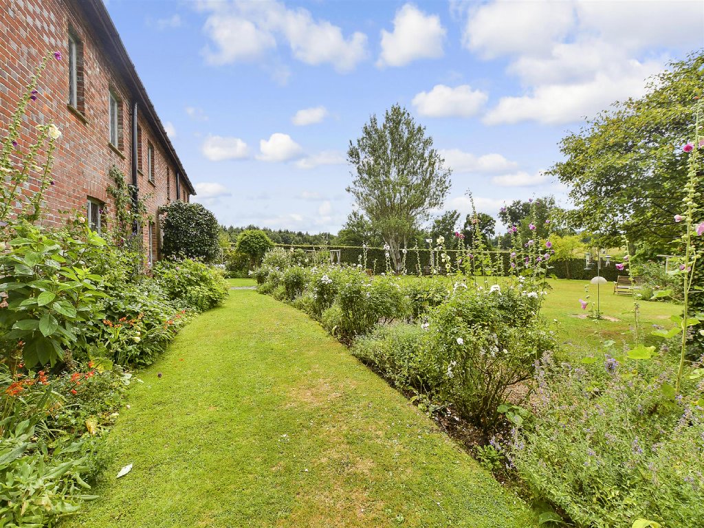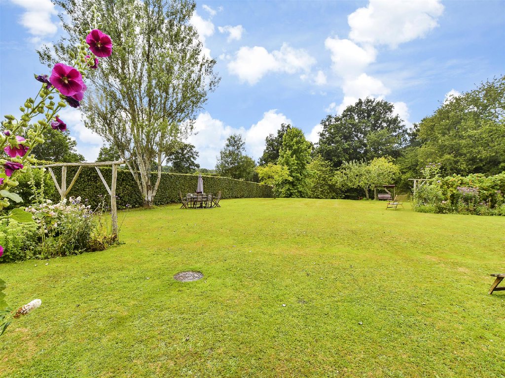 If you are looking for privacy and seclusion in a rural environment surrounded by fields and woodland, this characterful Oast house could be the answer. It is to be found up a private track that ultimately leads to a farm but provides access to an enclave of four properties that includes two barn conversions and the Oast, each surrounded by their own gardens and land in different directions, so each garden is not overlooked. The property is surrounded by just over an acre of beautiful gardens and grounds. It is approached via a gravel driveway with a double garage and a seven bar gate leading to a spacious inner parking area and a pathway to the main entrance flanked by shrub beds and lawned areas. With its roundel, attractive Victorian brickwork, chimneystacks, diamond pane windows and a charming pitched roof porch with an arched entrance it has instant appeal even before you walk through the front door and see the internal period features. These include exposed beams, beautiful fireplaces and the circular rooms. The period front door opens into the hallway with quarry tiled flooring, the staircase and understairs cupboard as well as the cloakroom. There is a very spacious light and bright triple aspect sitting room with exposed ceiling beams, French doors to the rear walled garden and an impressive limestone fireplace with a log burner you can cosy up to on a cool winter’s evening. A well-proportioned dual aspect family room provides a delightful place for relaxing in front of the TV or playing games with the family. It also has a fireplace with an unusual surround, a stone hearth and a log burning stove for cosy evenings in the winter. The very useful study includes a fitted cupboard and a door to the rear walled garden. Guests will enjoy being invited to sit down to a meal in the charming circular dining room with oak flooring and a westerly facing window that catches the evening sun. The dining room has direct access to the modern country style kitchen/breakfast room with its terracotta tiled flooring, Nobel oil fired four oven range cooker with a tiled splashback and attractive wall and floor units with oak worktops. Appliances include a fan assisted built in NEFF oven, and an integrated microwave, fridge and dishwasher. There is also a walk-in larder, a hatch to an un-boarded loft and a composite door to the rear walled garden. A secondary entrance lobby provides access to the utility room including a condensing Grant boiler (installed 2023), and spaces for washing machine, dryer, fridge and upright freezer. There is also access to a boarded loft. From the lobby, there is also a door to a double bedroom with an ensuite shower room. This is very useful for guests who find the stairs difficult, or it would make an excellent office for anyone working from home, as business visitors could use the secondary entrance and not venture into the private part of the home. However, because it is adjacent to the integral garage, there is the potential to create a totally self-contained annex, subject to the appropriate planning permissions. Upstairs, the landing leads to a contemporary family bathroom with loft access, a family shower room, and four double bedrooms. One of the bedrooms has a period cast iron fireplace while all the bedrooms have wonderful rural views across farmland and, in some cases, as far as the South Downs. The superb master suite is in the circular oast. The bedroom leads to a good sized dressing area with fitted wardrobes, and a door to a luxury ensuite bathroom with a claw footed rolltop bath. The bedroom has access to a boarded loft in the roof of the oast. There is access to a further unboarded loft from the dressing room. The secluded and secure grounds are another special feature of this property. There are swathes of lawn, beautiful specimen trees, recently planted fruit trees, delightful shrub and flower beds, and a vegetable garden all surrounded by six foot stock fencing covered by a beech hedge so is extremely safe for children and animals. It keeps the pets in and the deer out. There is also an underground rain water tank with a submersible pump providing water for the garden as well as two garden storage sheds and a greenhouse.