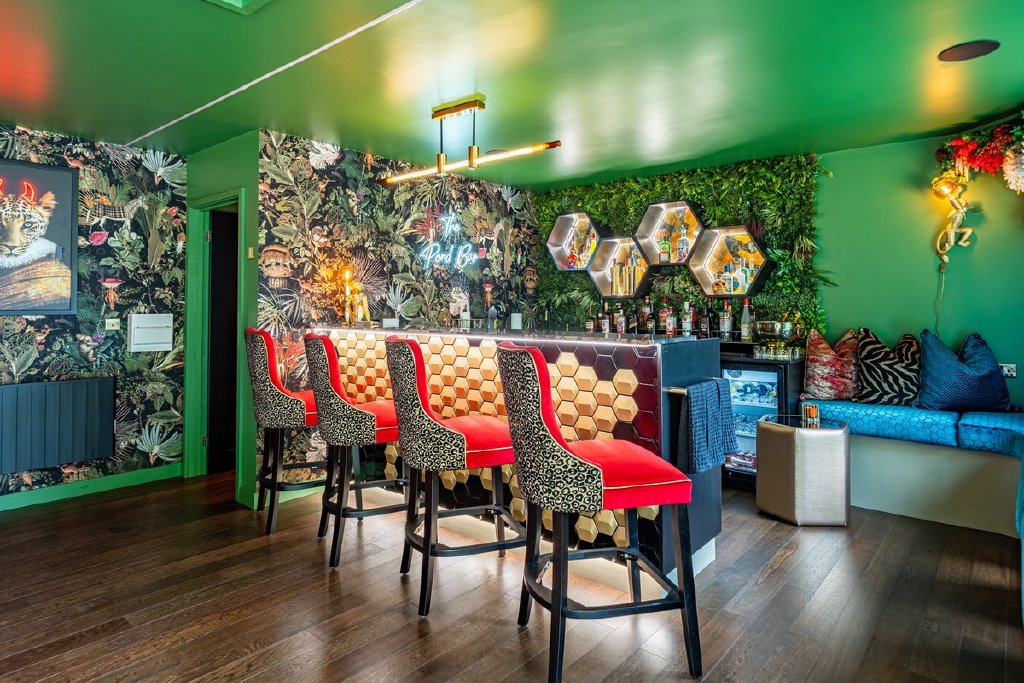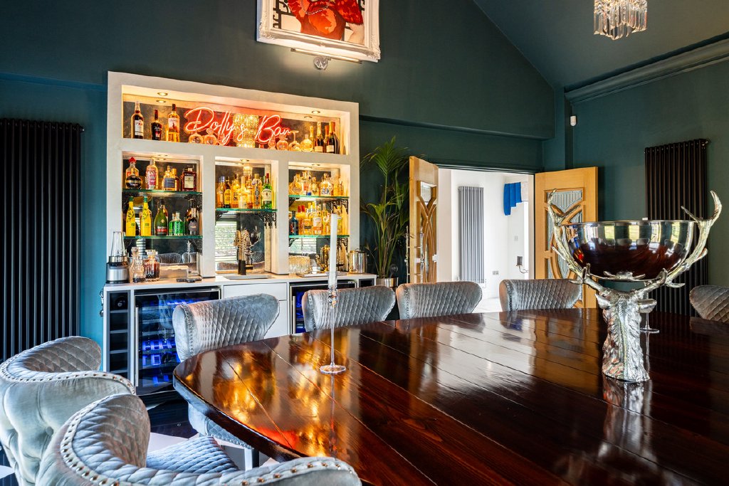 A true highlight of Hill View is the detached pond house, where considerable investment has created an exceptional leisure and entertaining retreat. Floor-to-ceiling glass doors open directly onto the surrounding terraces, seamlessly connecting the indoors with the landscaped gardens and enhancing the property’s remarkable sense of light and space. This impressive addition offers a year-round setting for family gatherings, elegant celebrations, and moments of relaxation.