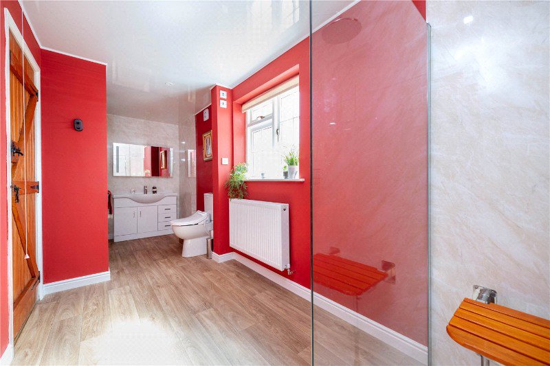 17’8 x 5’11 (max) With frosted window to the side aspect, comprising a modern refitted three-piece suite, low level WC, wash hand basin set in vanity unit and walk in shower with glass screen and aqua board, wood effect flooring and heated towel rail.