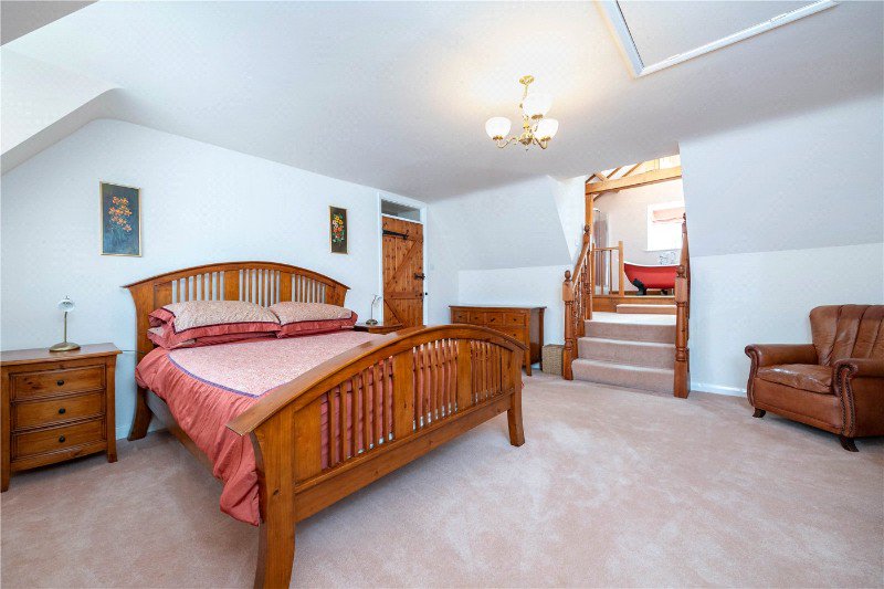 6’9 x 9’3 an impressive space with vaulted ceiling and exposed timber A frame with Velux window to the side, bespoke solid wood furniture including four double wardrobes, further steps lead up to: