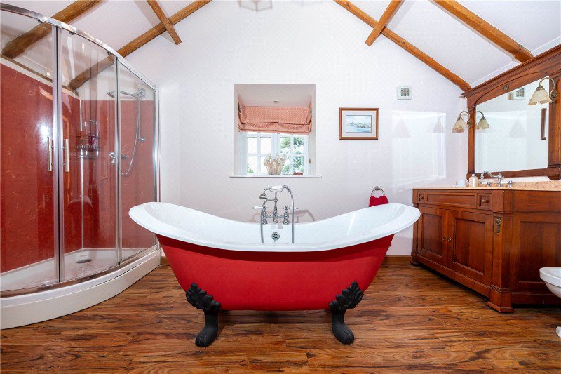 14’7 x 7’4 a luxurious en suite with window to the rear aspect, comprising a five-piece suite, with central roll top bath with shower taps over, low level WC, bidet, wash hand basin set in vanity unit and corner shower cubicle, wood effect flooring and heated towel rail.