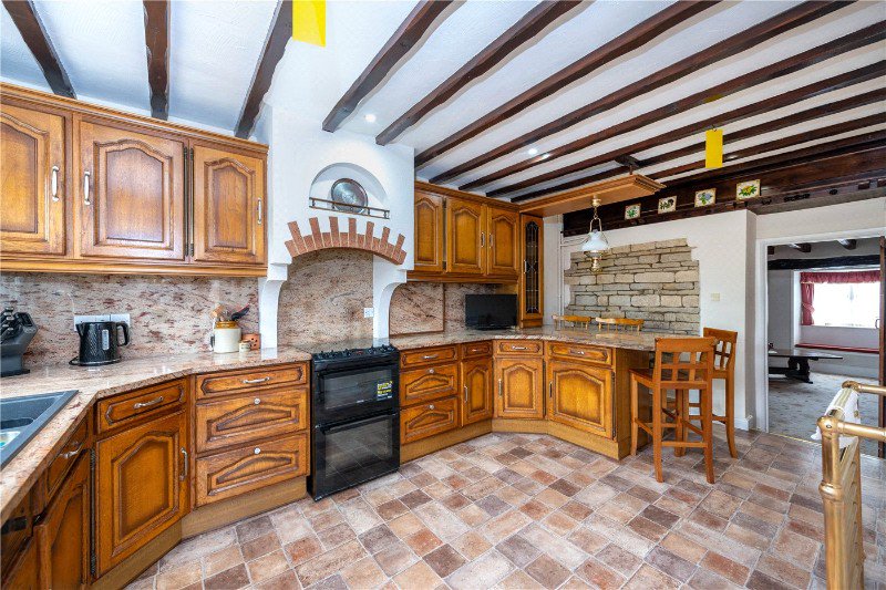 16’7 x 9’9 with double glazed window to the rear aspect, comprising a range of solid wood fronted base and eye level storage units, incorporating granite work surface with sink inset and mixer tap over, breakfast bar, cooker space, integrated dishwasher, heated towel rail and timber beams.