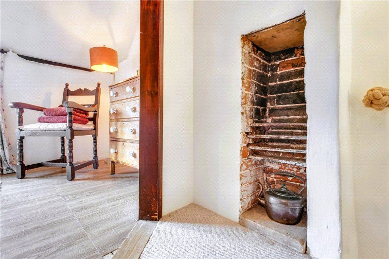 Upstairs, the original first-floor feature fireplace serves as a focal point, adding warmth and character to a peaceful retreat.
