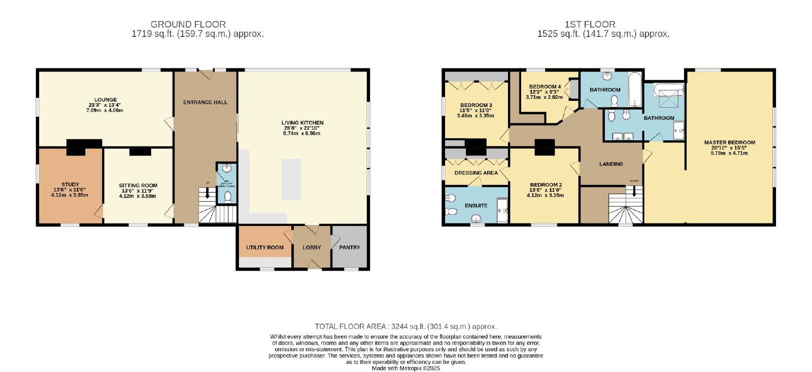 Upstairs, the master suite stands out with its private south-facing balcony. A guest suite with en-suite bathroom and dressing room offers comfort for visitors, while two additional double bedrooms and a family bathroom complete the first floor.