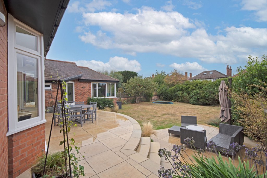 The rear garden has been thoughtfully landscaped to maximise sunlight throughout the afternoon and evening. A full-width raised terrace is perfect for outdoor dining, while steps lead to a lower patio and generous lawn framed by mature trees, shrubs, and established hedging.
