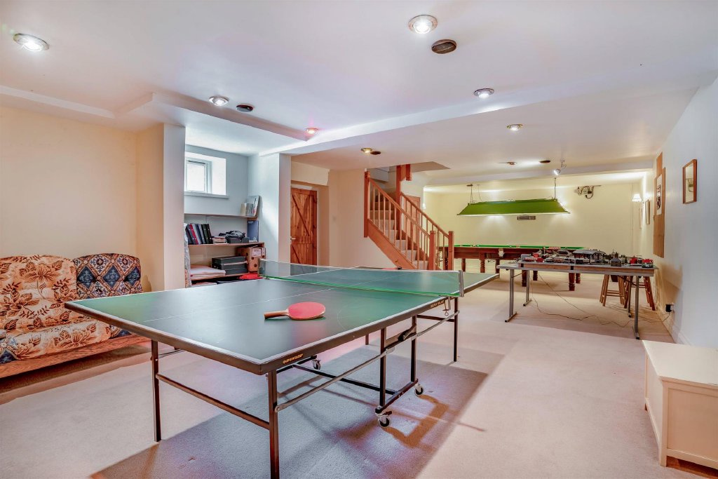 A door within the living room reveals an unexpected surprise: a staircase leading down to the substantial lower ground floor, where you'll find a spacious room, currently used as a games room. There's room for a snooker table, table tennis, and even a model railway. It would also make a superb cinema room the possibilities here are endless.