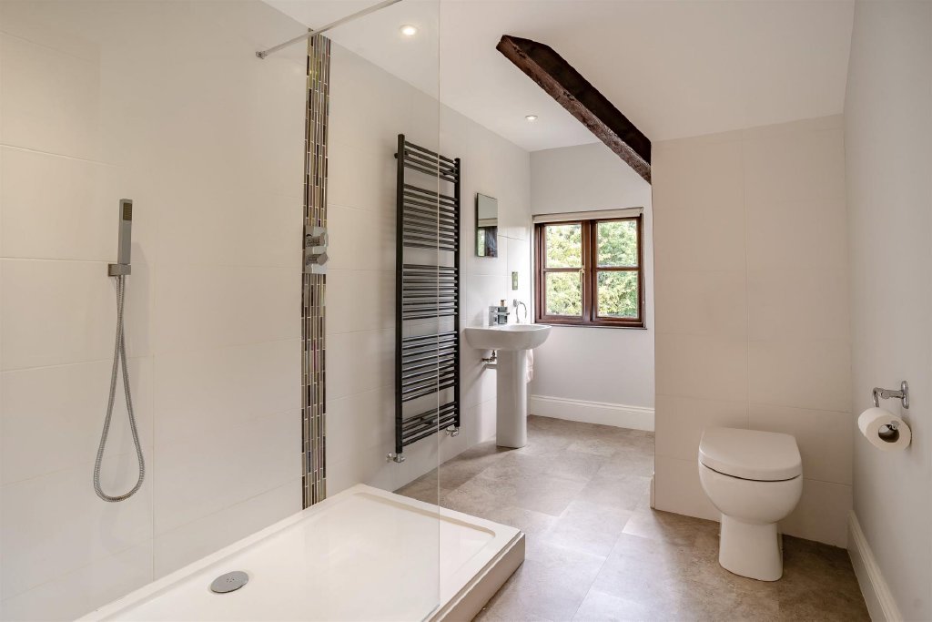 Upstairs, there are four bedrooms in total. Two could easily be considered principal suites: one to the front enjoys a triple aspect outlook, a dressing room, and an en-suite; the other is a light-filled room with stunning views across neighbouring fields, fitted wardrobes, and its own en-suite. Another bedroom features a characterful fireplace and enjoys dual aspect views across both the fields to the rear and the garden to the front, while the fourth bedroom sits adjacent to a modern family bathroom.