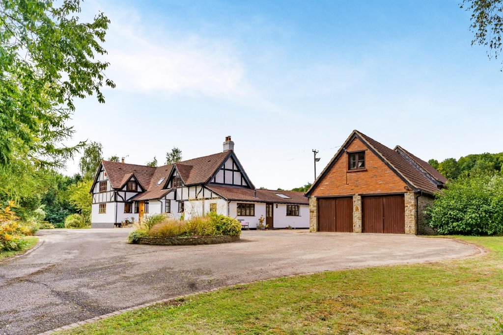 The driveway culminates in a generous turning circle in front of the house, providing ample off-road parking. At the far edge of the land lies a gently wild woodland, with meandering paths cut through to encourage exploration while supporting insects and local wildlife.
