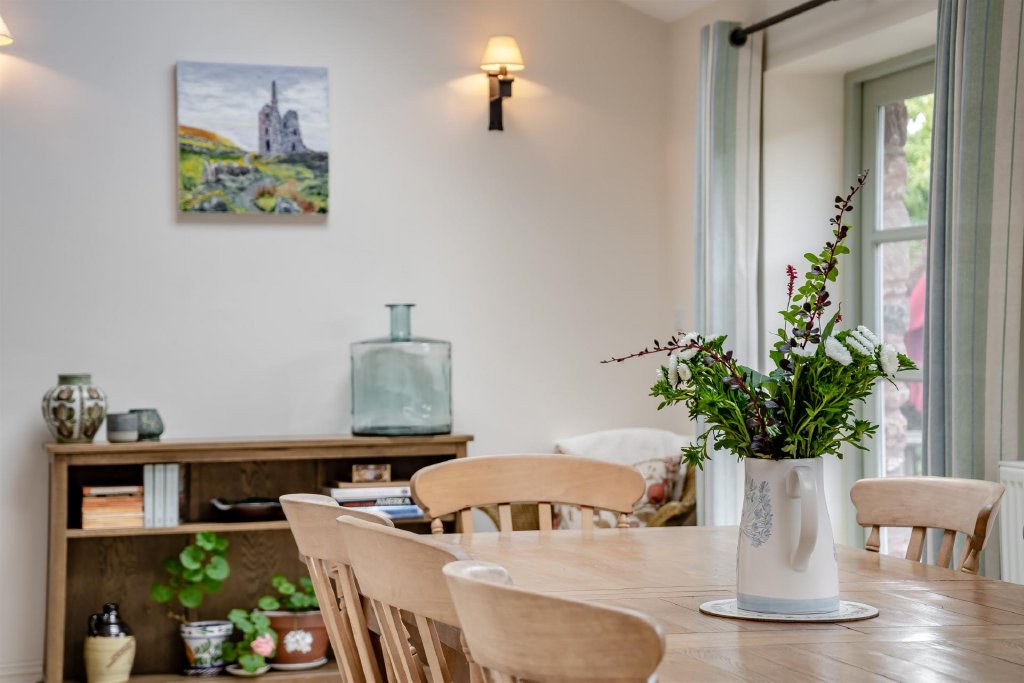 The jewel in the crown of the ground floor is the modern kitchen diner, a later extension that blends the old and new parts of the house seamlessly. The Shaker-style kitchen is well-equipped with space for a Falcon range cooker, dishwasher, and American-style fridge freezer. The dining and family area enjoys a vaulted ceiling and is flooded with light from four large Velux-style windows, while two sets of French doors open onto an alfresco dining area at the rear. Just off the kitchen lies a generous utility / boot room, providing ample space for white goods as well as a practical area for shedding muddy shoes and boots.