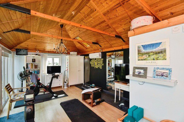 Annexe/Gym Currently utilized as a home gym, this versatile space was originally built as an annexe for guests. It features air source heating/air conditioning and includes a fully fitted shower room. Equipped with electricity and wired for Wi-Fi, it also serves as an ideal home office.