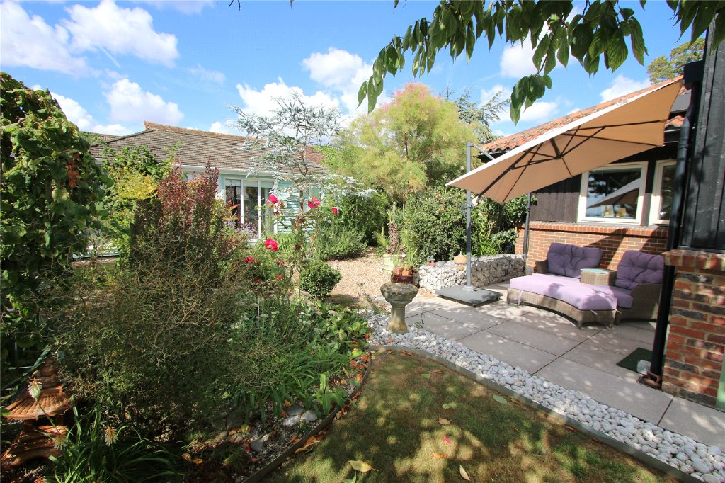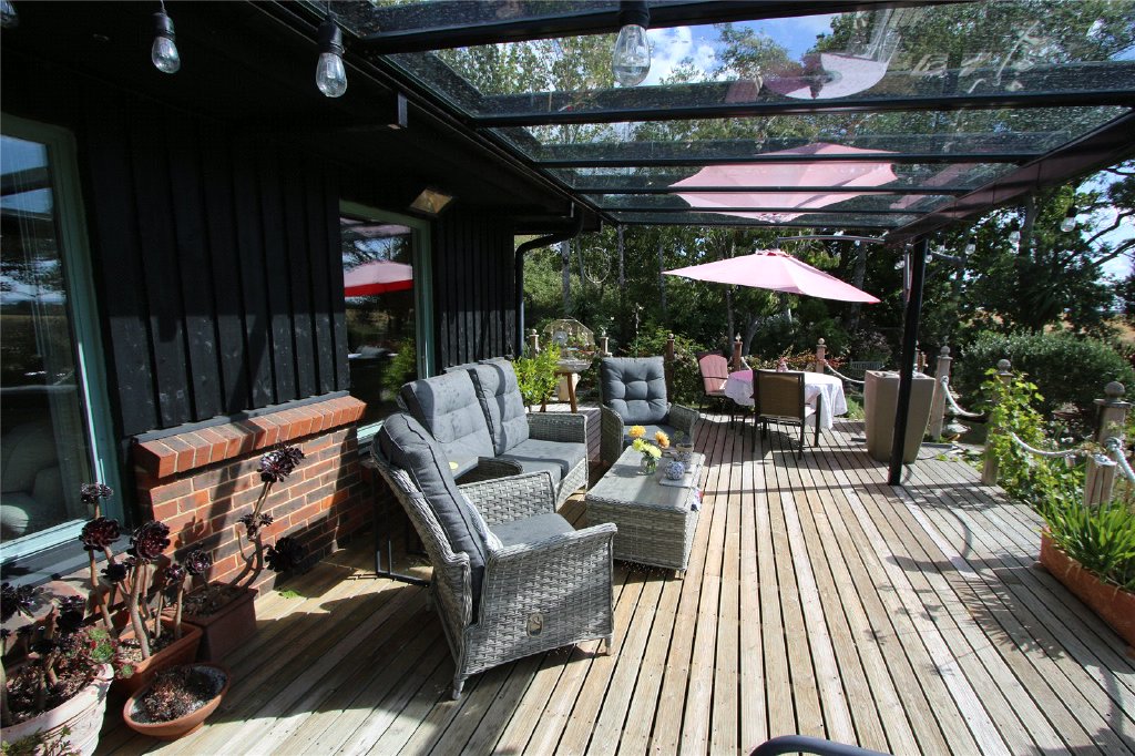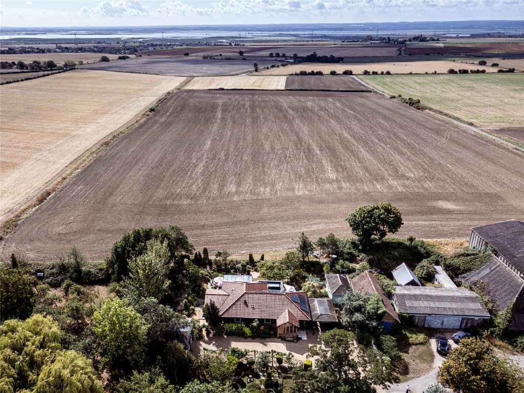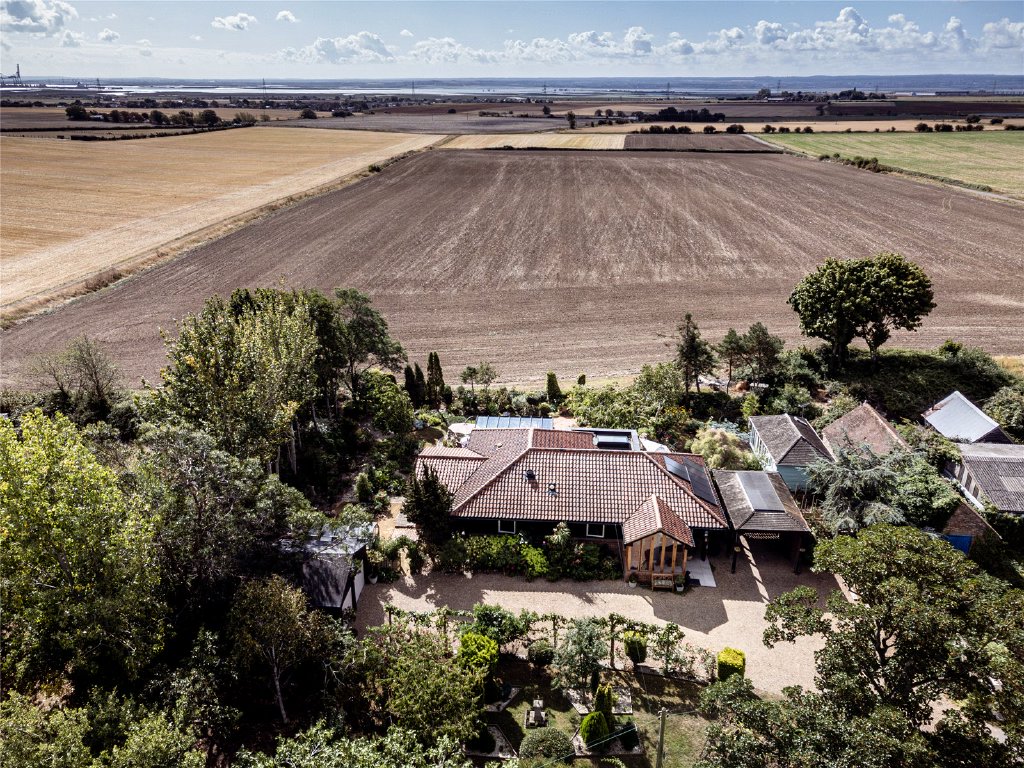 Plotters is situated in St Mary's Hoo, on the Hoo peninsula, surrounded by open Farmland. This property offers the tranquility of the countryside while being just minutes away from local villages and major transport links. It is a unique, detached single-storey home set on a 0.5-acre plot, designed to make the most of its south-facing position. The home overlooks open farmland with views of the River Medway and provides a light, open, and airy atmosphere ideal for family living and entertaining.