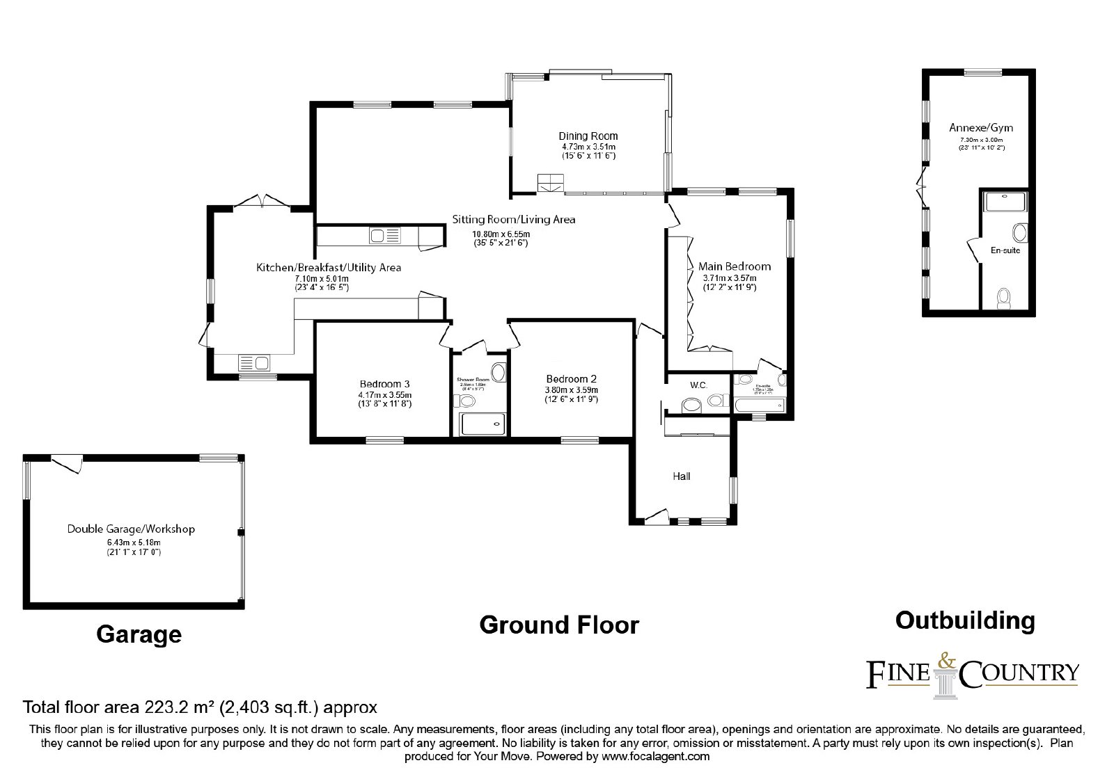 Inside, the property includes three double bedrooms, with the master bedroom boasting an en-suite bathroom. There is also a family bathroom, two reception rooms, a separate south-facing dining room, a large fully fitted family kitchen/breakfast room with a utility area, and a hallway cloakroom/WC. Including the external annexe and garage, this impressive home offers a total of 2,403 square feet of living space.