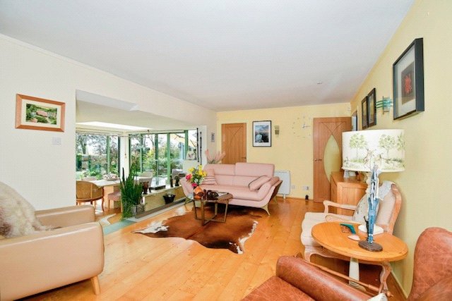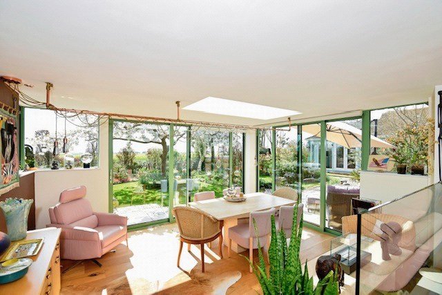 Dining Room 15'6" x 11'6" (4.72m x 3.5m). Accessed from the lounge, this split-level dining room features two glass steps leading into the space, complemented by a glass balustrade with integrated lighting for a modern touch. Oak wood flooring and underfloor heating add comfort, while two sets of glass sliding doors provide access to the rear garden and deck. A large glazed roof light offers a striking visual appeal.