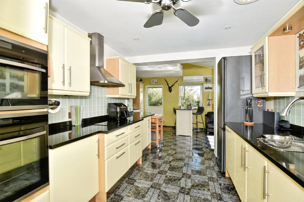 Kitchen/Breakfast/Utility Area 23'4" x 16'5" (7.1m x 5m). The family kitchen/breakfast area is fully fitted with high-quality floor and wall units that provide ample storage, topped with sleek black granite countertops. It includes integrated electric double ovens, a microwave, an induction hob, a Quooker hot water tap, a dishwasher, and a washing machine. The utility area has useful double sinks. An airing cupboard houses the controls for the solar panels. Ceramic tiling runs throughout, and glazed doors lead out to the deck, with an additional door to the side for access to the front of the property and the garages. This area is equipped with an air source heating and air conditioning unit, and the property is fitted with a positive pressure air ventilation system.