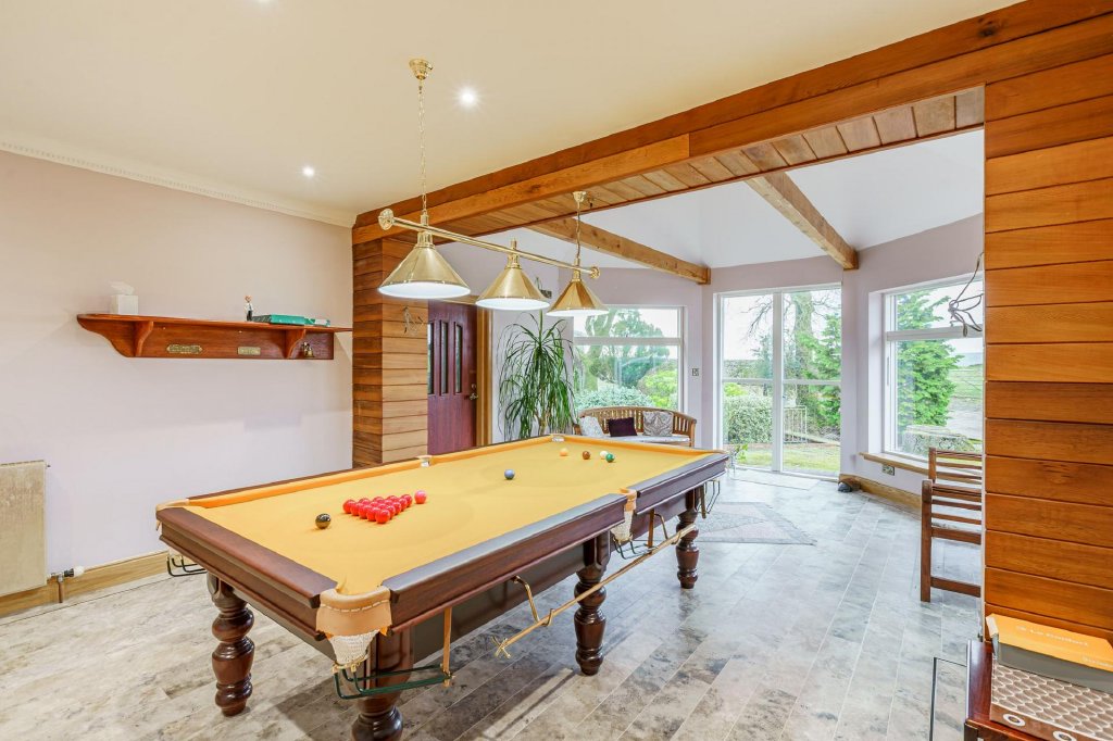 There are three ground floor double bedrooms, one of which has a dressing area and modern en-suite shower room. The family bathroom is fully tiled and comprises a double ended bath, WC, wash hand basin and large shower cubicle with jets. The bright games/sunroom offers direct access to the garden and could be subdivided to create an additional ground floor bedroom. A useful L-shaped utility room and adjacent storeroom complete the ground floor accommodation.