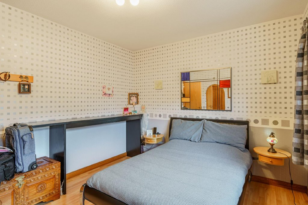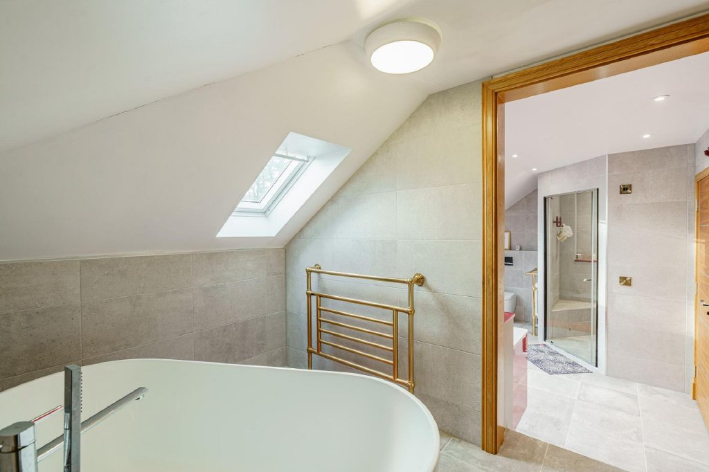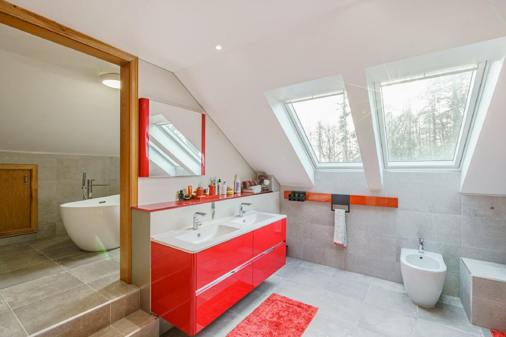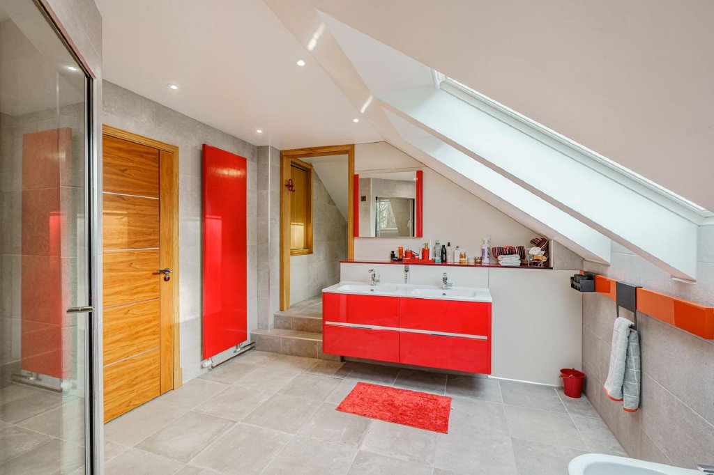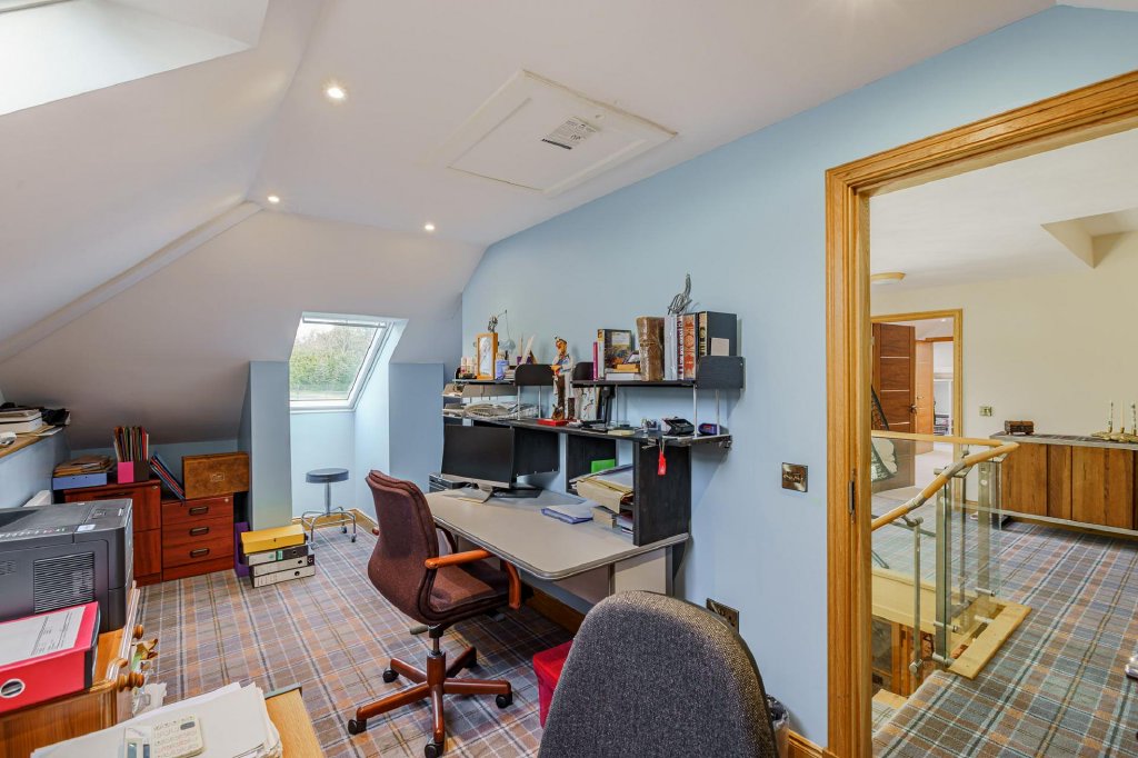 The bespoke staircase rises to a bright and spacious first floor landing, with sliding doors to a balcony. The first floor makes for a fantastic master suite if so desired, with useful home office (or perhaps a nursery/child’s bedroom) and a large principal bedroom with dressing room and views to the front over the loch, along with a contemporary bathroom, comprising a raised area with feature free standing bath, twin sinks and a roomy walk-in shower.