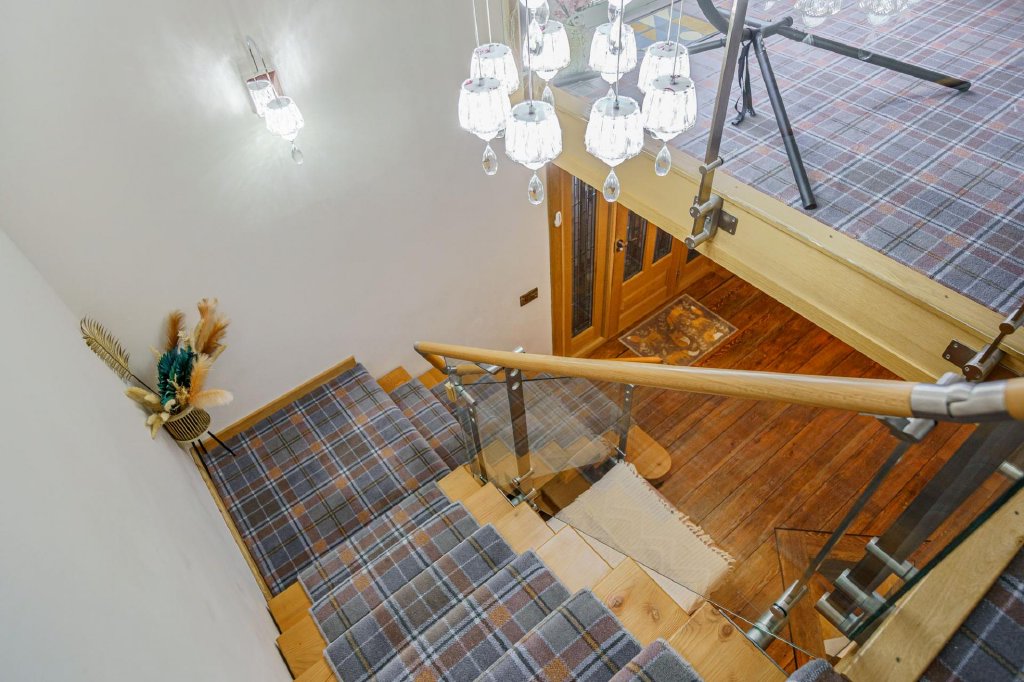 This charming detached two storey chalet is constructed of Scandinavian timber and was specially imported for the owner. It is presently rented out providing additional income but could equally offer ideal accommodation for dependent relatives. It is quietly situated in a corner of the grounds and has a wraparound balcony offering superb views across the Nith Valley. There is a spacious open plan kitchen/sitting/dining room with galleried landing above, and there are two double bedrooms and a modern family bathroom, as well as a utility room and plenty of storage in the eaves space.