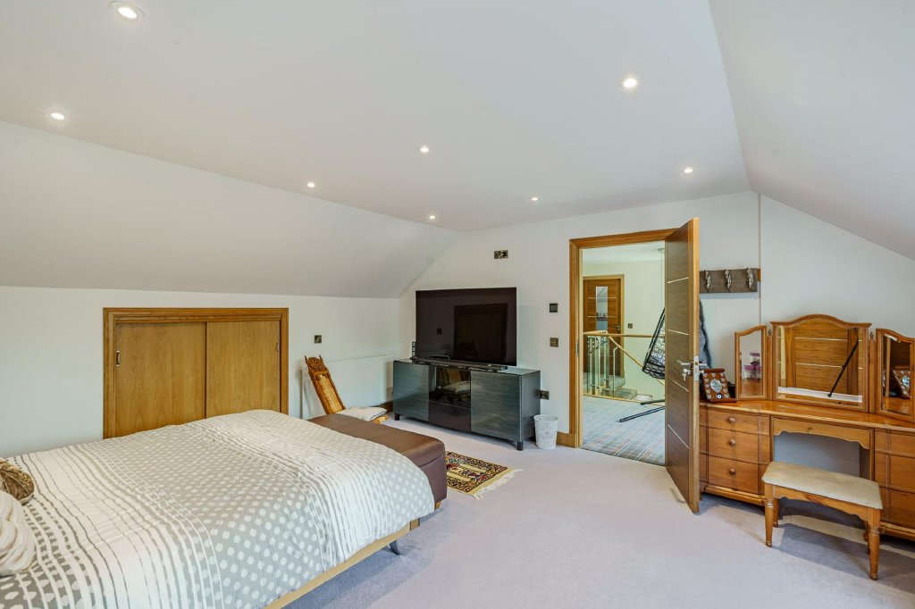 The front door opens into an entrance vestibule, with cloaks area and WC off. An internal glazed door leads into the large reception hall, which boasts Karndean flooring and a feature contemporary staircase rising to the first floor. Double doors from the hall lead through to the superb open plan kitchen/dining room. The kitchen area is fitted with an excellent range of contemporary fitted units, with range cooker, integrated dishwasher and island with breakfast bar. The room enjoys a dual aspect, Karndean flooing and has ample room for a large dining table and chairs. Adjacent to the kitchen is the generous sitting room, which features a wood burning stove set within a stone surround. French doors lead out to the patio and barbecue area, which is a lovely spot to enjoy al fresco entertaining.