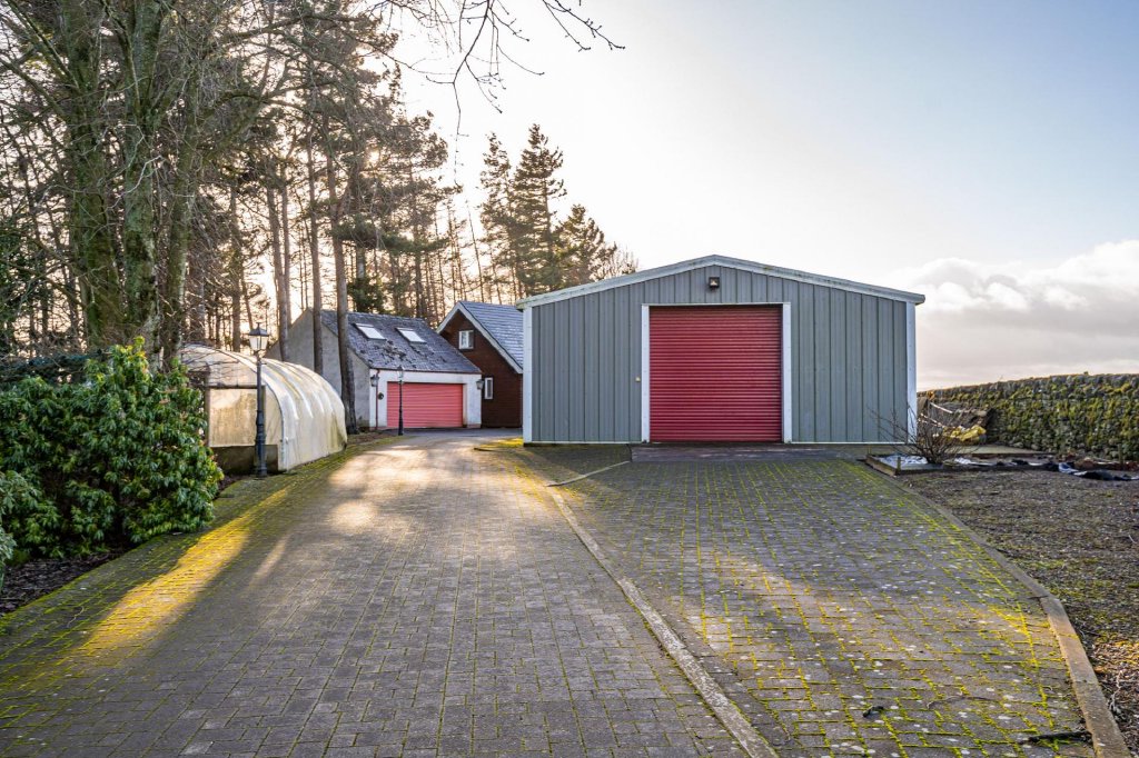 The property is approached via a short section of shared drive (the driveway is owned by Mill Grange) giving access to the neighbour, and then via electronic gated access, culminating in a large, paved turning circle with ample parking. Here, the driveway forks off and leads towards the agricultural shed (12m x 8m) and chalet, where even more parking can be found.