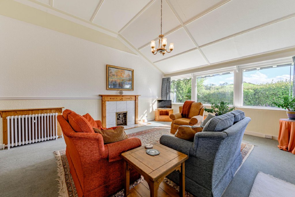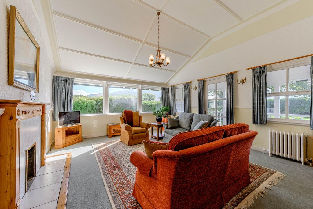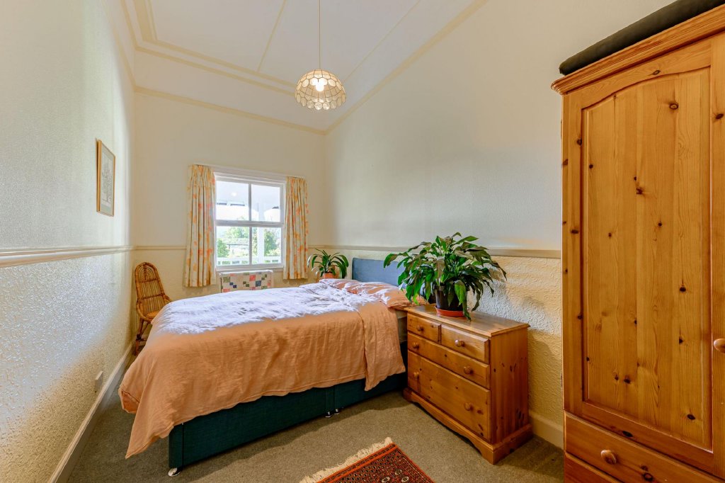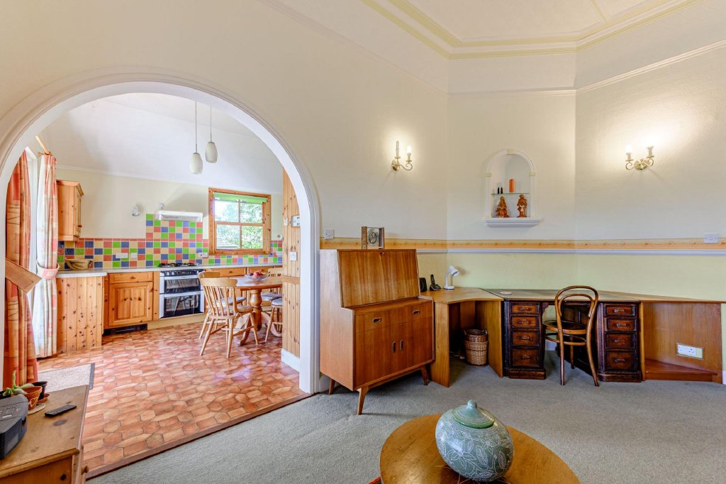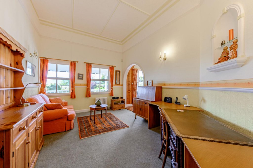 A generous living room offers plenty of natural light having a large expanse of windows on both external walls. A glazed door also offers access to the veranda. The original fireplace remains a focal point but is currently unused. An electric, gas or log burning stove could easily be installed here for additional heat. A semi pitched ceiling adds character and its beautifully detailed.