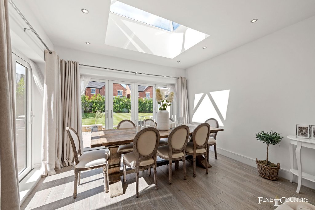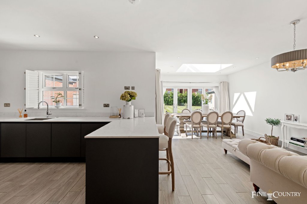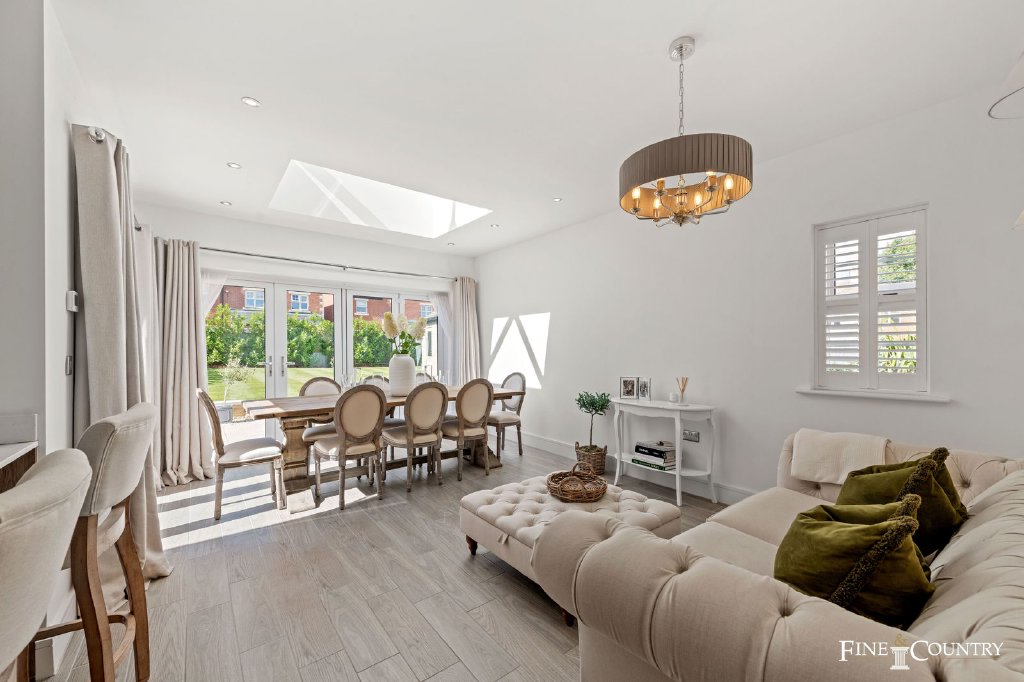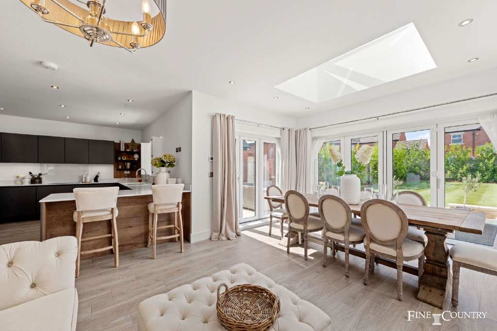 The rear of the ground floor is devoted to a striking open-plan kitchen, dining and family space, stretching the full width of the house. This is the true heart of the home, designed with both everyday living and entertaining in mind. Two sets of bifold doors open directly to the garden, blurring the boundary between indoors and out, while a dramatic roof lantern – a pitched skylight that draws daylight deep into the space – makes the room glow even on grey days.