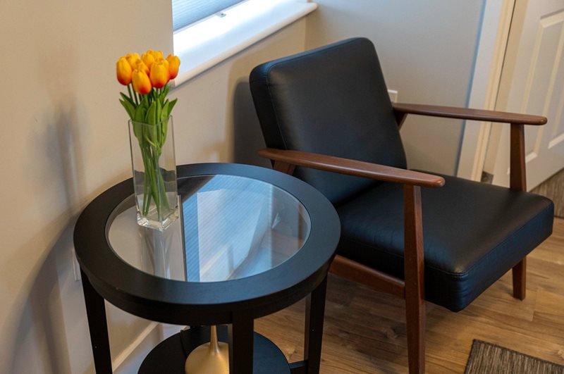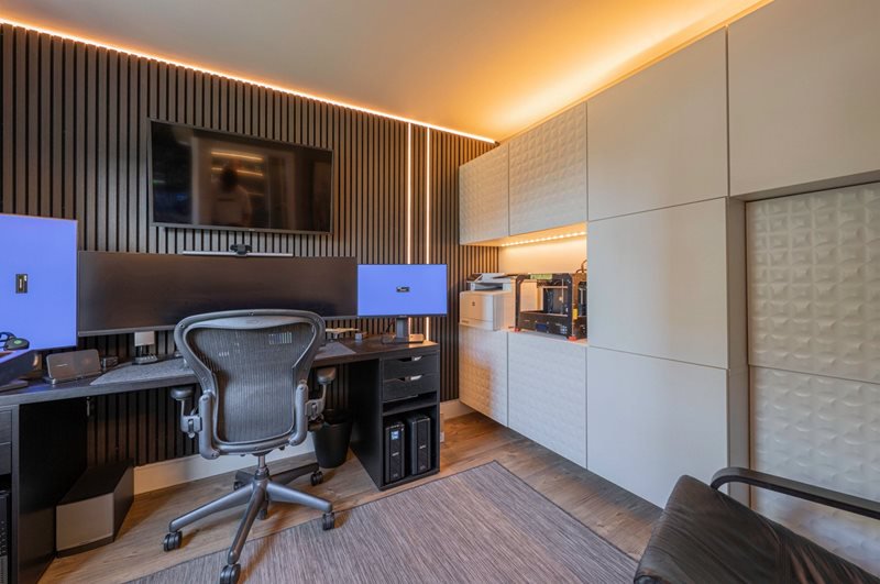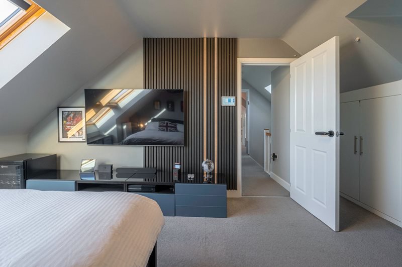 A central entrance hallway provides access to all principal rooms, including a spacious study—ideal for home working or as a playroom. The sitting room has been enhanced with a bespoke media wall and fitted shelving, creating a stylish and functional focal point.