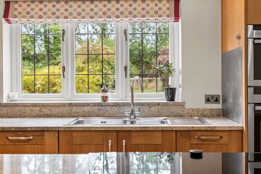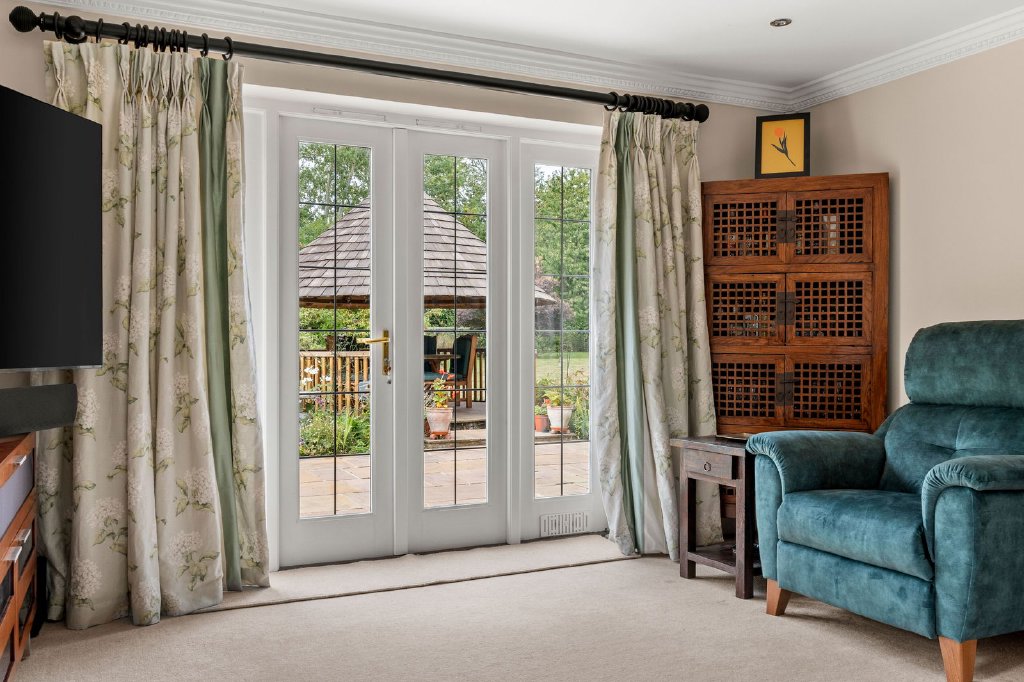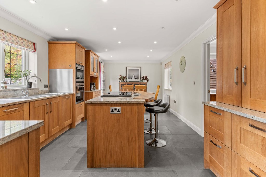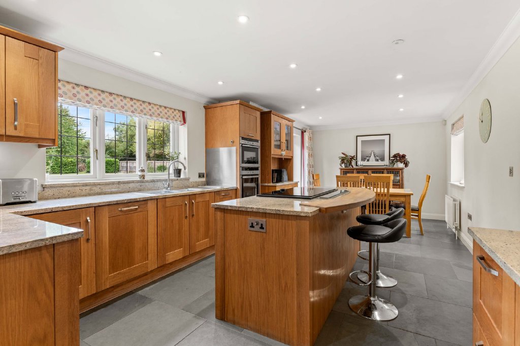 At the heart of the home lies the stunning 31ft. kitchen/breakfast room, designed with both style and practicality in mind. Generously proportioned, it features a central island with breakfast bar, granite worktops, and handcrafted luxury cabinetry housing a range of integrated Neff appliances. Underfloor heating adds to the comfort, while French doors lead out to the garden, an ideal space for summer gatherings. A well-planned utility room sits just off the kitchen and provides direct access outside.