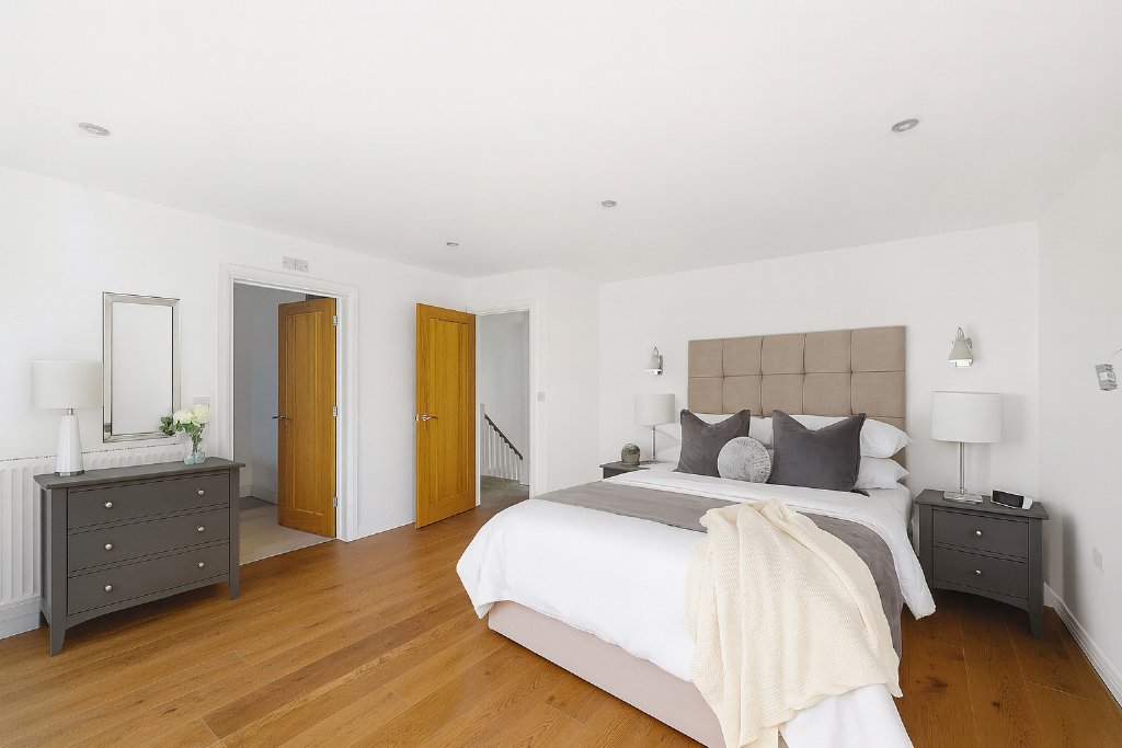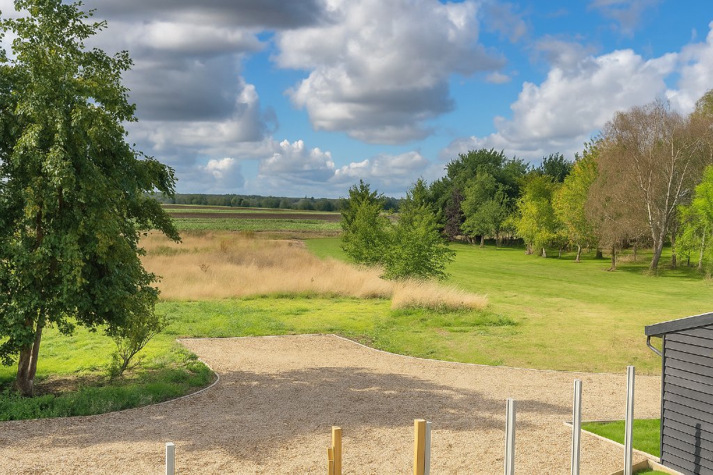 Upstairs, every bedroom enjoys an open outlook, giving a wonderful sense of space. The principal suite feels indulgent, with a dressing area, an en suite featuring both a freestanding bath and walk-in shower, and a private balcony, perfect for a slow Sunday coffee overlooking the countryside. Three further bedrooms and a family bathroom ensure comfort for family and guests alike.