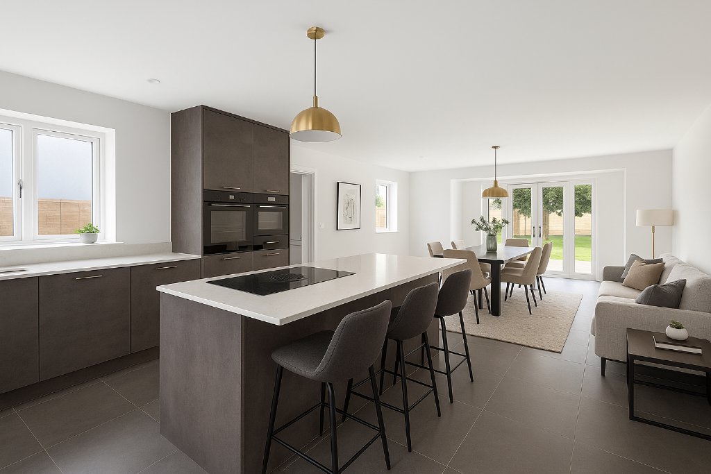 From the moment you step inside, the sense of space and light is uplifting. A generous entrance hall opens into the reception rooms and the striking open-plan kitchen and dining area. This is the true heart of the home, where friends can gather around the central island with a glass of wine while supper is prepared, and children can finish their homework at the table before heading out to play on the green. Quartz worksurfaces, a downdraft hob, and a suite of integrated appliances make it a joy for keen cooks, while wide doors open directly to the garden terrace, encouraging summer barbecues and long lunches outdoors.