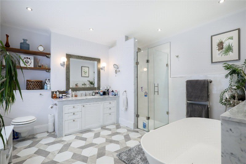 Ascending to the first floor, you'll find two luxurious bedroom suites, each with private ensuite bathrooms. One benefits from a walk-in wardrobe, while the other features a private dressing room, adding a boutique hotel feel.